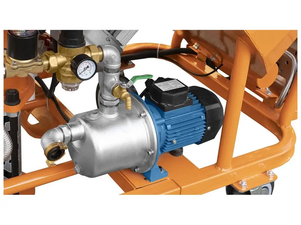 Напірний двигун підтримує постійний потік води до змішувача, незалежно від тиску в мережі. Завдяки цьому зберігаються точні пропорції вода/суміш, а розчин виходить однаковим протягом усієї робочої зміни.