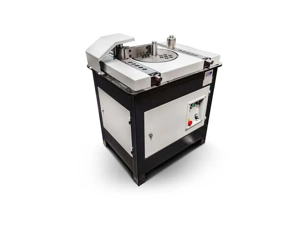 Згинач арматури, прутків, дроту та плоских прутків. Ідеально підходить для згинання як арматурних стремен, так і різних арматурних ферм з гладкого та ребристого дроту. Завдяки використанню відповідних інструментів можна гнути елементи для художньої ковальства, які використовуються, наприклад, у виробництві воріт, огорож, балюстрад і т.д. Зварна сталева рама та робочий стіл забезпечують стабільну роботу навіть у складних умовах. Машина має два режими роботи: автоматичний та ручний.