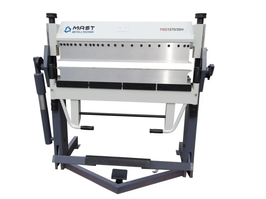 Листозгинальний верстат MAST Metalltechnik PBB1270/3SH призначений для виготовлення складних виробів із листового металу, таких як короби, піддони та інші профільні металовироби. Дозволяє працювати з товщиною листа до 1,5 мм і шириною до 1270 мм. Згинання складних елементів здійснюється за допомогою трьох сегментних балок: верхньої притискної, нижньої опорної і поворотної згинальної. Кожна балка має комплект сегментів (13 шт) різної ширини, комбінуючи які можна виготовляти широкий спектр форм різної складності.