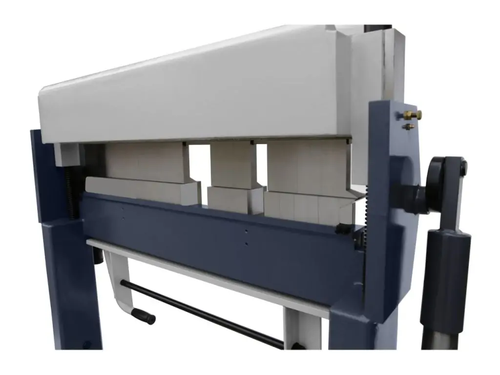 Підйом верхньої балки до 45 мм дозволяє встановлювати заготовки з уже зігнутими елементами і полегшує виймання готових деталей. Поворотна згинальна балка укомплектована обмежувачем кута згину. Притиск листа за допомогою ножної педалі звільняє руки для точного позиціонування заготовки. Для полегшення роботи оператора цей листогиб з сегментами має противаги і пружинну компенсацію згинальної балки. Повністю металева конструкція захищена від корозії та не потребує складного технічного обслуговування.