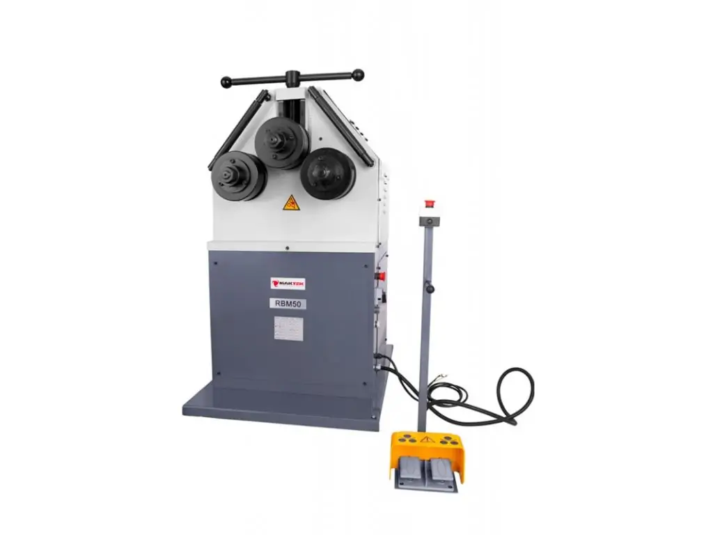 Електромеханічний згинальний верстат CORMAK RBM 50 призначений для якісного згинання профільних труб, смуги та прутка з метою отримання дугоподібної форми деталей у формі арок, кола, спіралей й інших форм. Верстат укомплектований трьома роликами, два з них є привідними та запускаються через редуктор. Радіус вигину можна регулювати верхнім роликом за допомогою важеля та ноніунсної шкали у верхній частині верстата. Ролики регулюються по ширині. Обертання вліво-вправо зі швидкістю 9,3 об/хв. Діаметр валу - 50 мм, діаметр роликів - 160 мм.