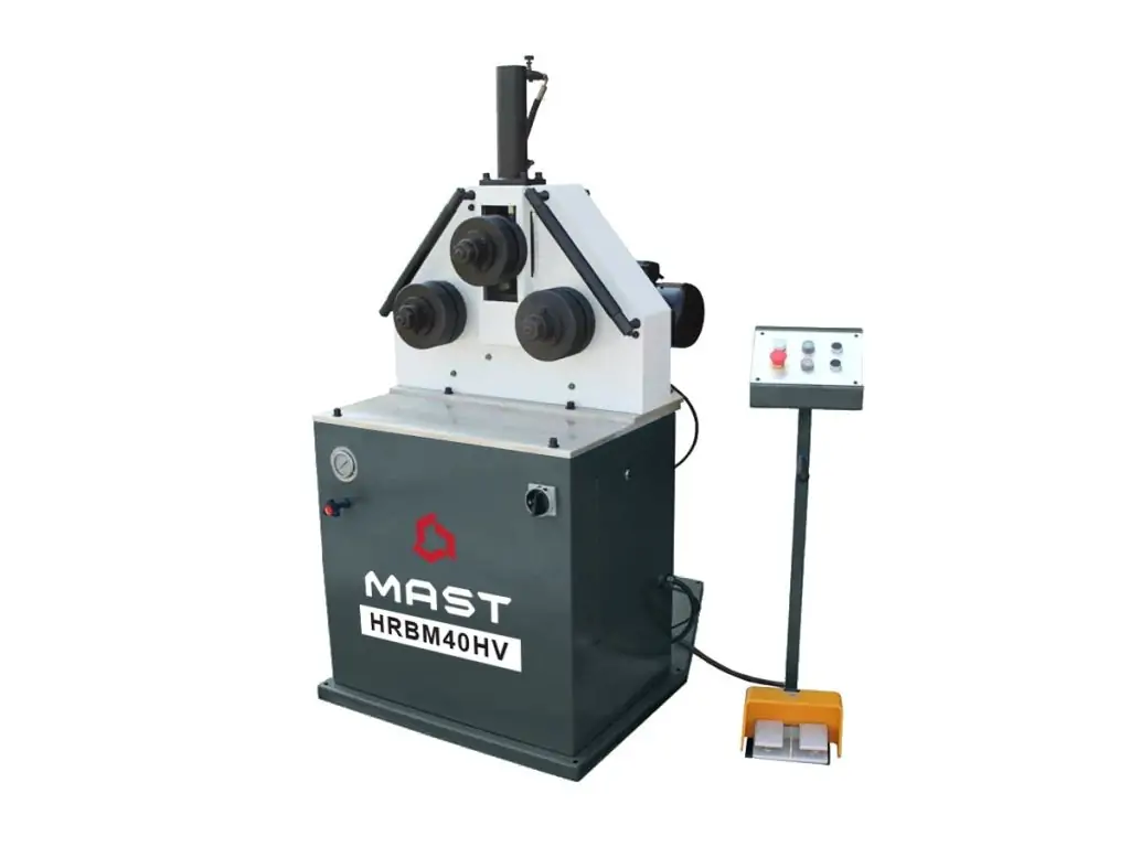 Гідравлічний профілезгинальний верстат MAST HRBM 40HV - це надійний інструмент для згинання профільних труб, смуги, прутка, тавра та швелера. Оснащений двигуном потужністю 1,5 кВт. Міцна конструкція з двома нижніми приводними валками діаметром 40 мм і твердістю роликів HRC48-52, які регулюються по ширині, дає змогу виконувати широкий спектр завдань з максимальною точністю.