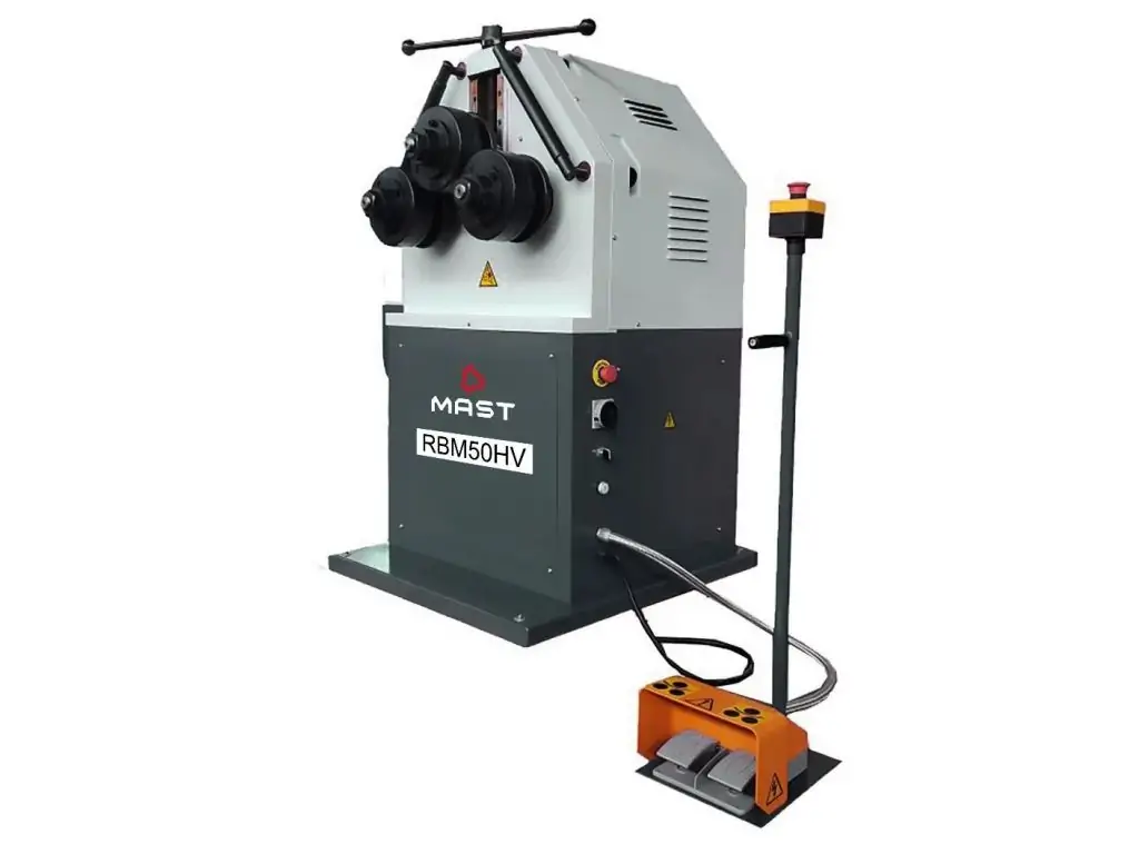 Верстат для гнуття труб та профілю MAST RBM50HV - це електрогідравлічне тривалкове обладнання для згинання труб, прутків, швелерів, кутників, смуг і профілів. Максимальний розмір заготовок - Ø 70 мм для круглих труб і прутків, 100х15 мм для смуги, 60х60х3 мм для квадратного та прямокутного профілю. Два нижні валки приводяться в рух електродвигуном потужністю 2,2 кВт. Гідравлічний привід верхнього валка забезпечує плавне і контрольоване формування потрібної дуги.