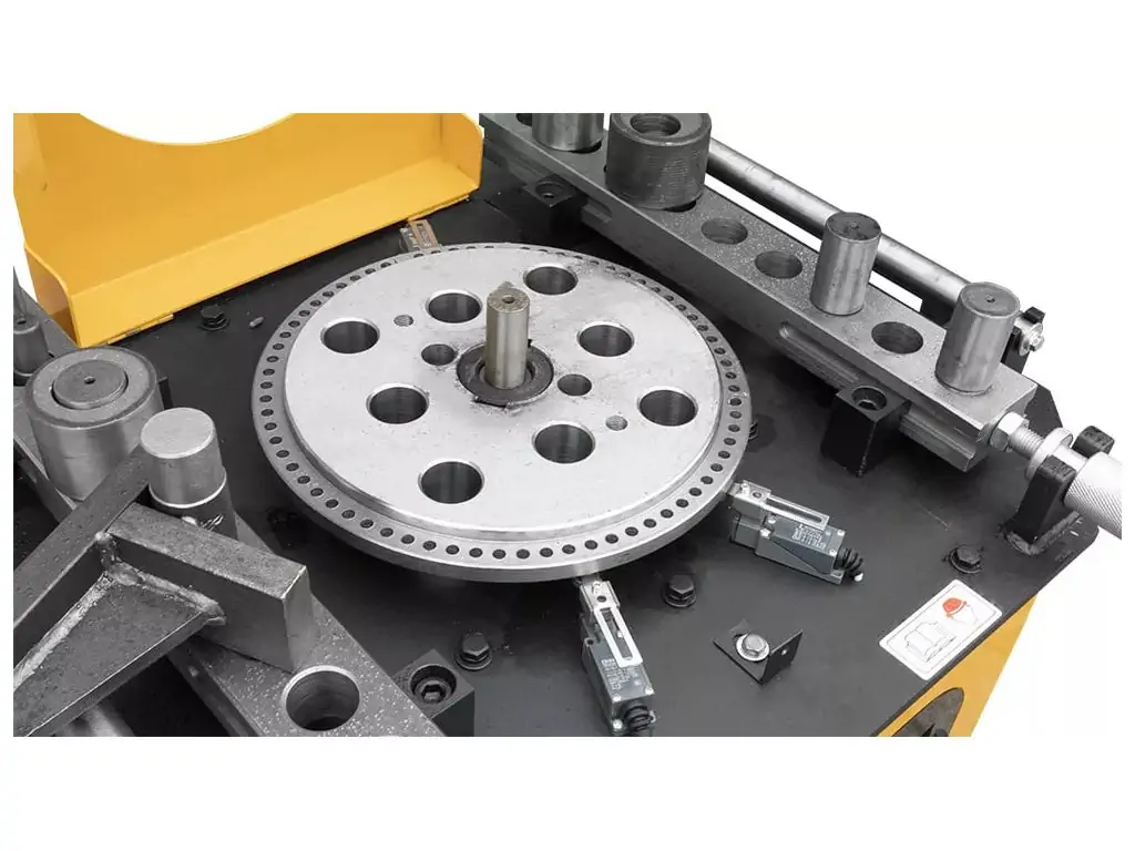 Масивний горизонтальний згинальний диск має систему отворів, в які вставляються центральний, згинальний та упорний штифти. Переставляючи їх, можна змінювати радіус згину та схему опори (одинарний, подвійний згин тощо). Система кінцевих вимикачів забезпечує високу повторюваність і точність кутів. Можливість попереднього встановлення кількох фіксованих кутів згинання і одночасного гнуття кількох прутків меншого діаметра суттєво підвищує продуктивність, що робить цей арматурогиб електричний ефективним для серійного виробництва.