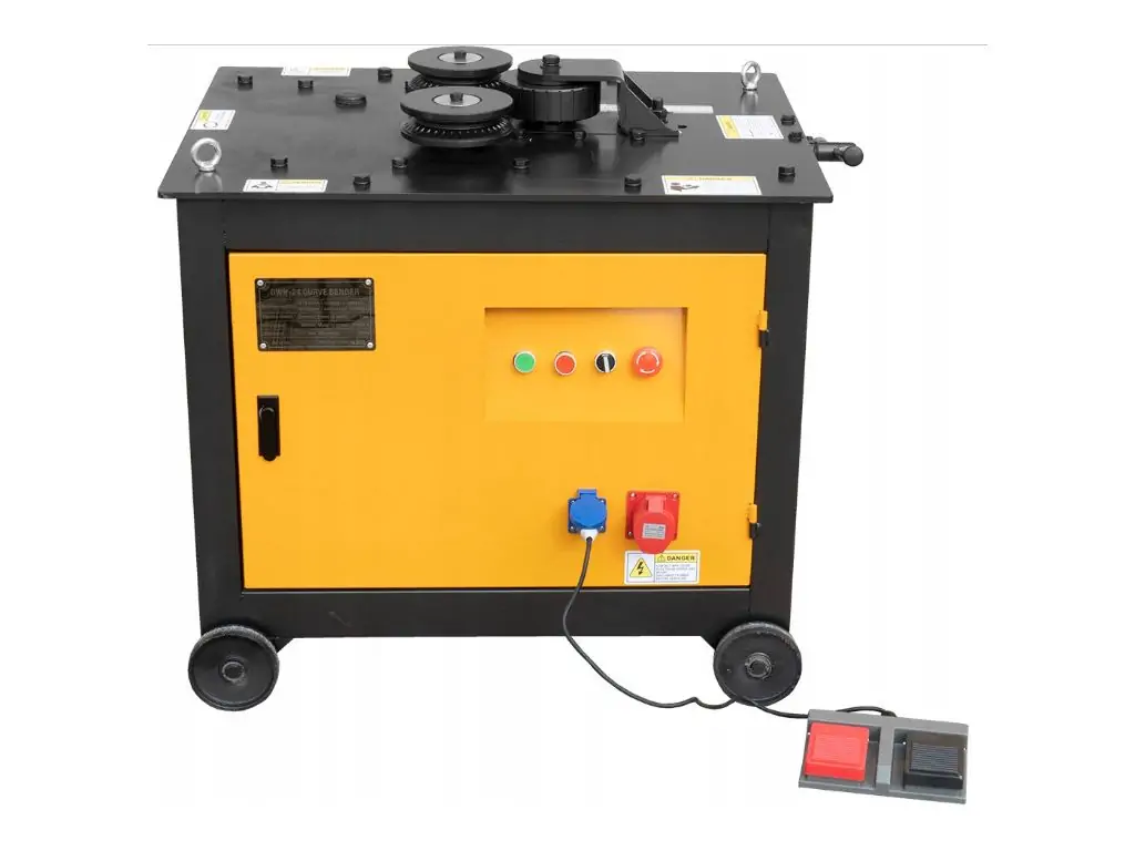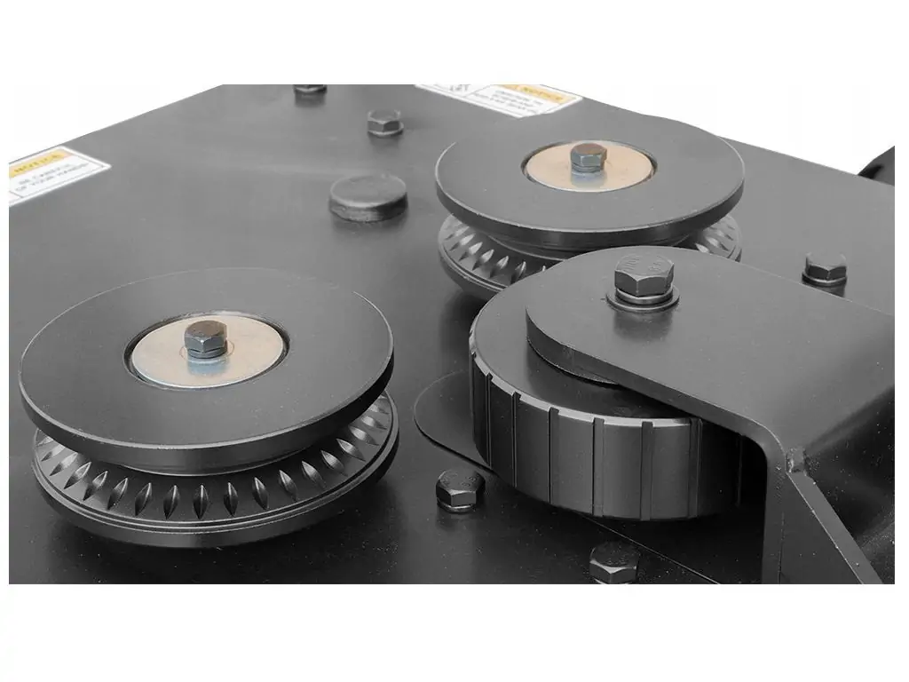Ролики виготовлені із загартованої сталі, що гарантує їх стійкість до зносу та деформацій. Для регулювання радіуса згину положення направляючих роликів можна змінювати. Робоча поверхня виготовлена зі сталевої плити товщиною близько 10 мм. Ручний і автоматичний режими роботи дозволяють використовувати цей роликовий арматурогиб для різнотипних завдань, а проста панель керування - швидко освоїти роботу з верстатом.