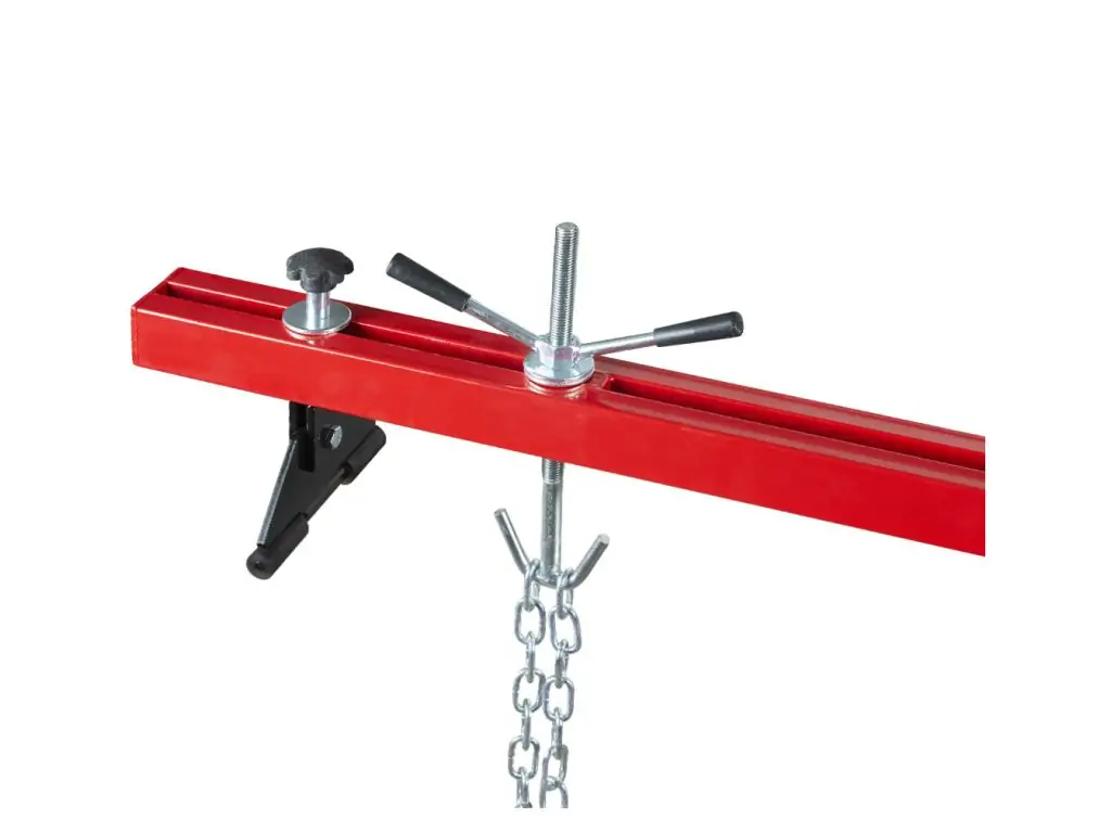 Балка виготовлена з високоміцної сталі, що гарантує стійкість до деформацій і механічних пошкоджень. На кінцях розміщені широкі поліуретанові накладки, які запобігають пошкодженню лакофарбового покриття і крил авто. У центрі балки розташований гвинтовий механізм, який дозволяє плавно і точно регулювати висоту підвішеного двигуна до 24 см. В комплект поставки входить ланцюг для з'єднання гвинтового механізму з технологічними петлями двигуна. Така підйомна балка для двигуна може монтуватися на стаціонарну стельову балку, розпірний стенд, міні-кран або пересувний портал.