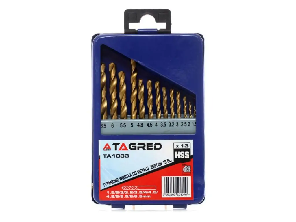 Набір свердл по металу TAGRED TA1033, 13 шт - рекомендовані для використання в майстернях, для обробки легованих і вуглецевих сталей підвищеної твердості, ковкого чавуну, залізних агломератів, кольорових металів і затверділих пластмас. Свердла виготовлені зі швидкоріжучої сталі з твердістю 62°HRc (+/-2°), кутом загострення 118°, прямим заточуванням без корекції зсуву, придатні для ручного заточування.