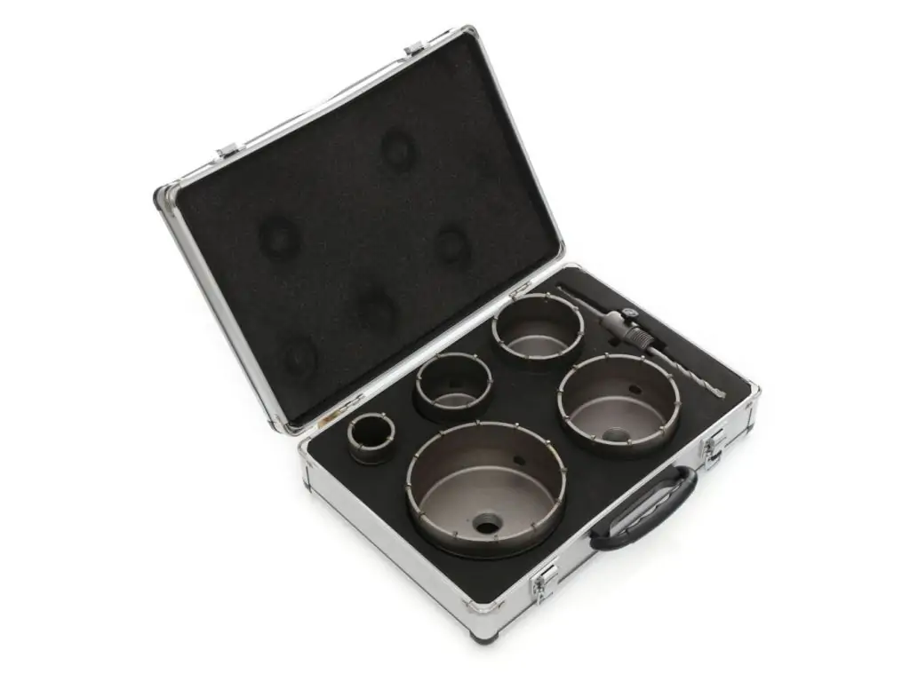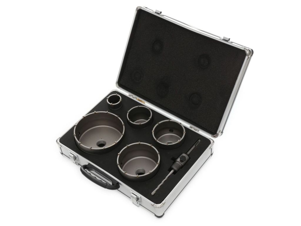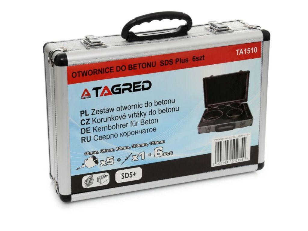 Набір кільцевих коронок для бетону SDS Plus і SDS Max TAGRED TA1510 - виготовлений зі сталі найвищої якості, а вилка - з дуже твердого матеріалу - карбіду. Завдяки адаптеру коронки можна встановлювати в стандартні патрони SDS-PLUS. Адаптери також підходять для встановлення в стандартні затискні головки. Весь набір укладений в дуже естетичний і функціональний кейс для зручного зберігання і транспортування інструментів.