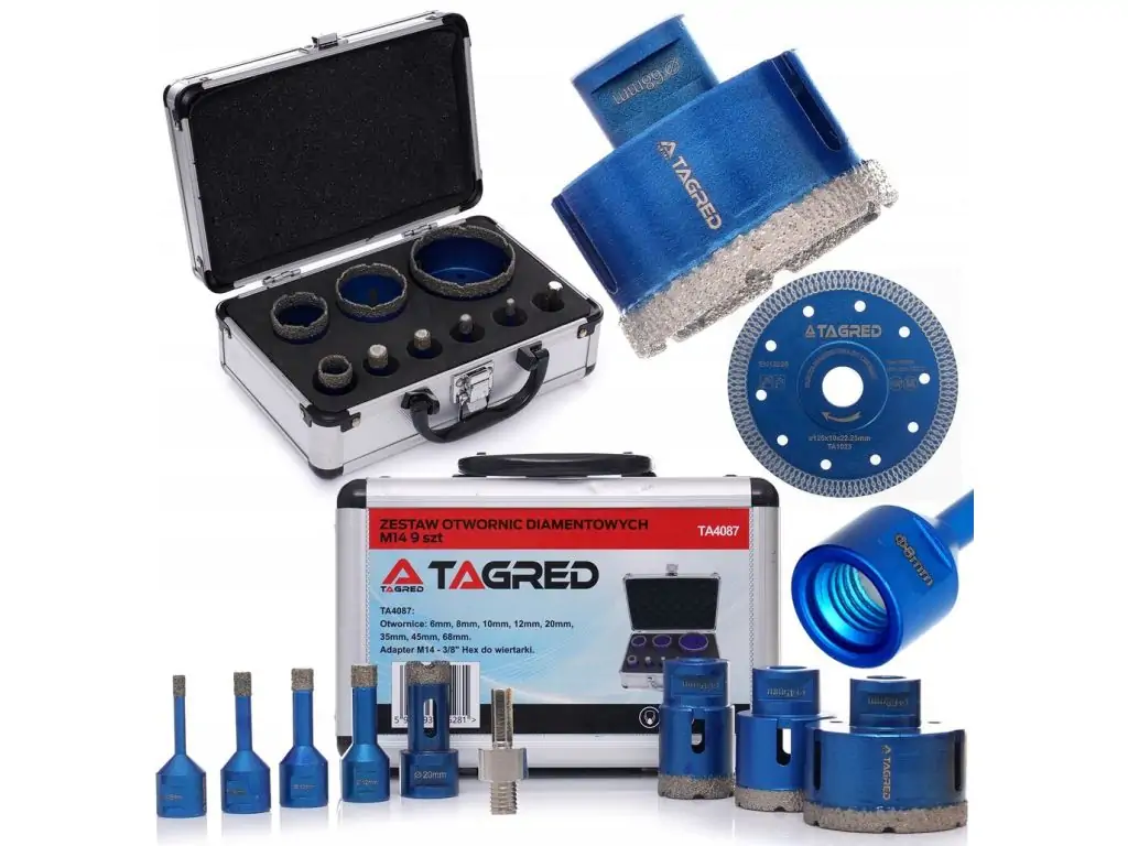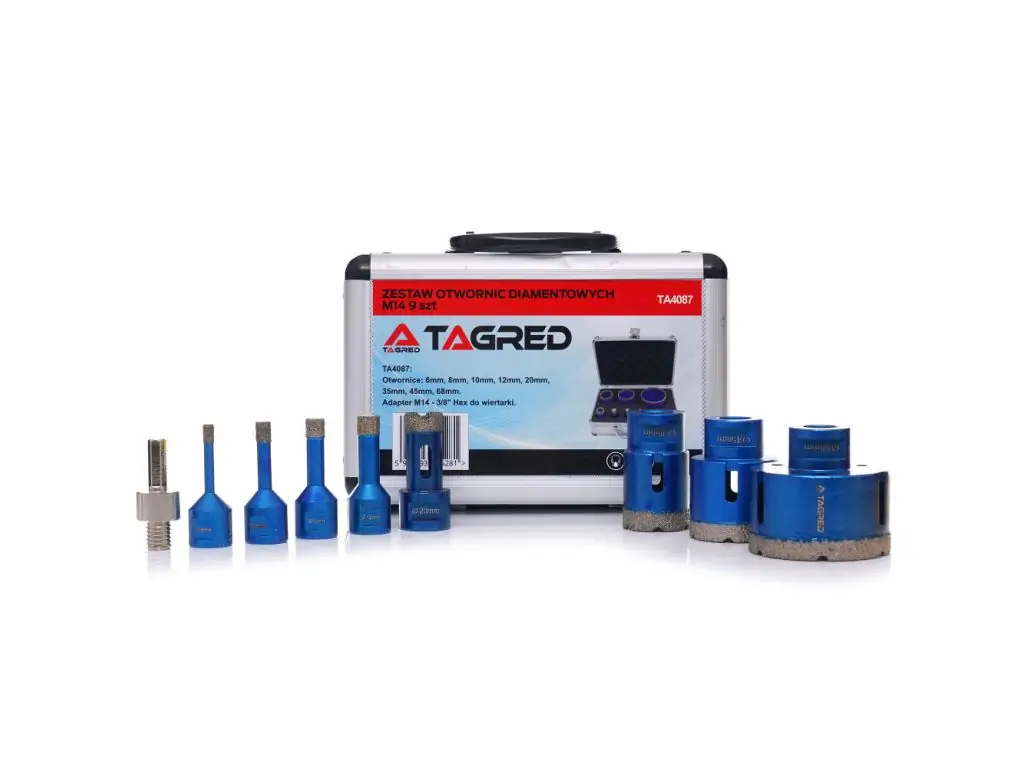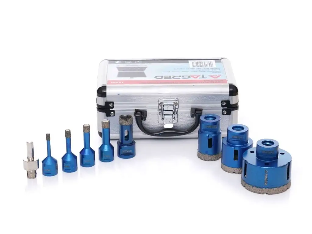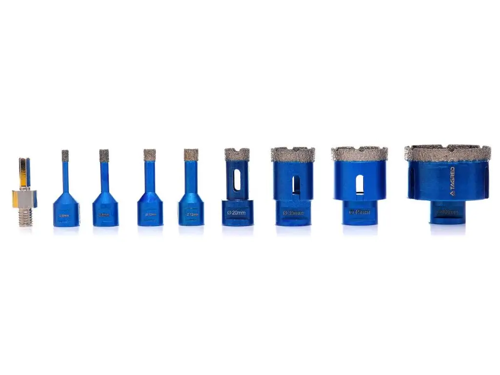 Кільцеві алмазні коронки TAGRED TA4087 - самоохолоджувальні та ефективні алмазні свердла для дрилів та кутових шліфувальних машин дозволяють виконувати чисте свердління всіх типів плитки без використання водяного охолодження. Професійні алмазні коронки були встановлені з використанням технології вакуумного паяння. Їх цінують за швидкість свердління дуже жорстких матеріалів. Бічні отвори для пилки прискорюють свердління та видалення матеріалу.