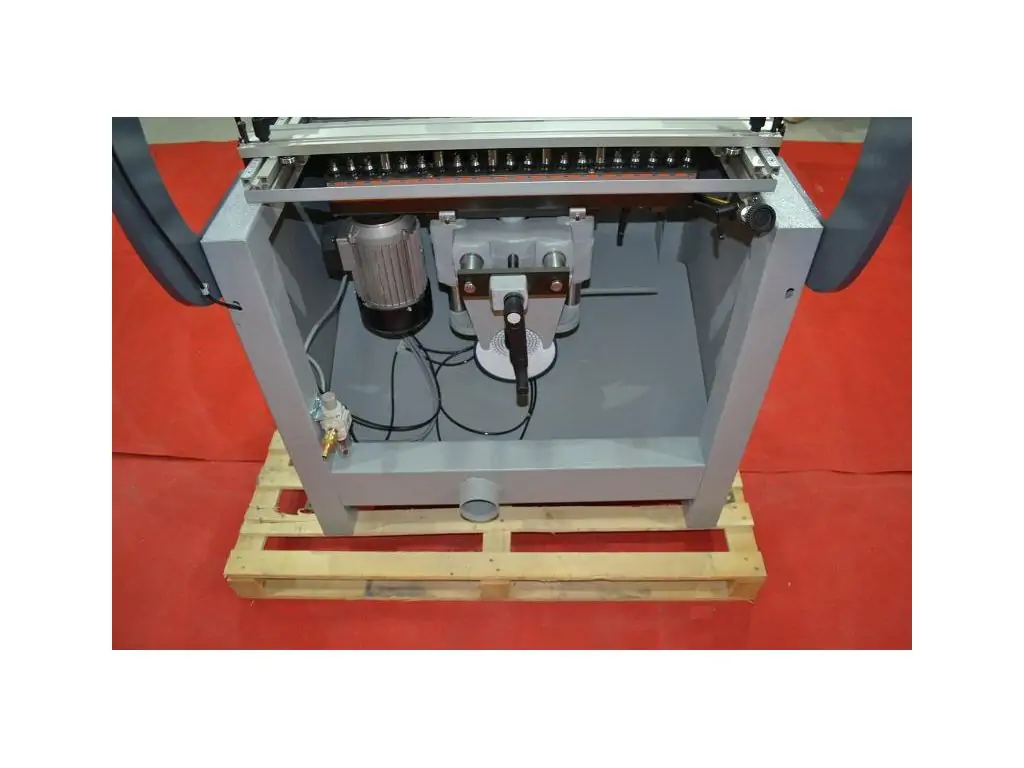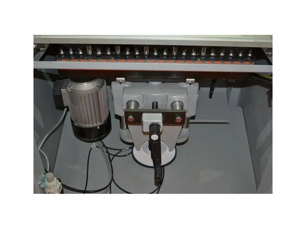 Свердлильно-присадочний верстат Stomana BM 21E - це професійне обладнання для високоточного свердління отворів у площинах і торцях меблевих заготовок. Оснащений свердлильною головою на 21 шпиндель, кожен з яких є окремим вузлом з власними підшипниками. Крок між центрами шпинделів становить 32 мм, що відповідає стандартам меблевого виробництва. Багатошпиндельна конструкція забезпечує високу продуктивність верстата, синхронність і повторюваність отворів. Міжосьова відстань між крайніми шпинделями 640 мм дає змогу обробляти заготовки шириною до 850 мм. Максимальна глибина свердління становить 65 мм. Для налаштування глибини свердління є револьверний механізм.