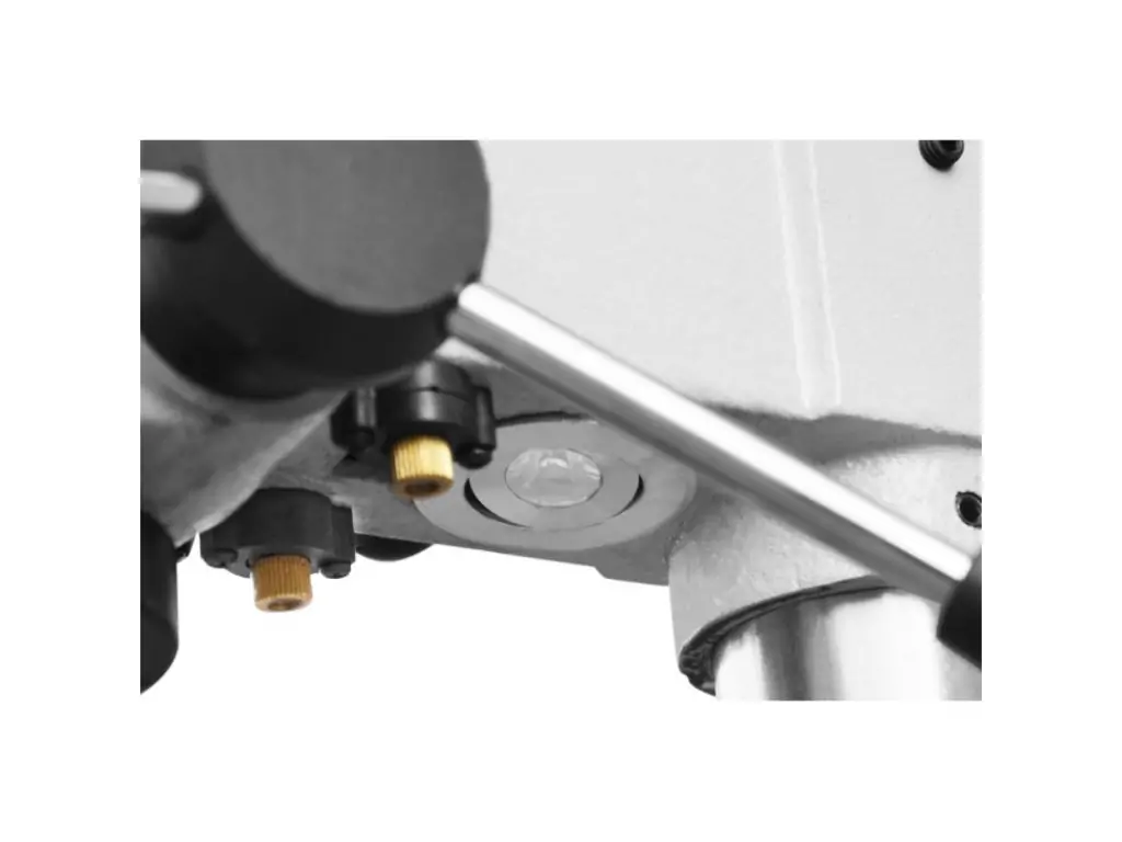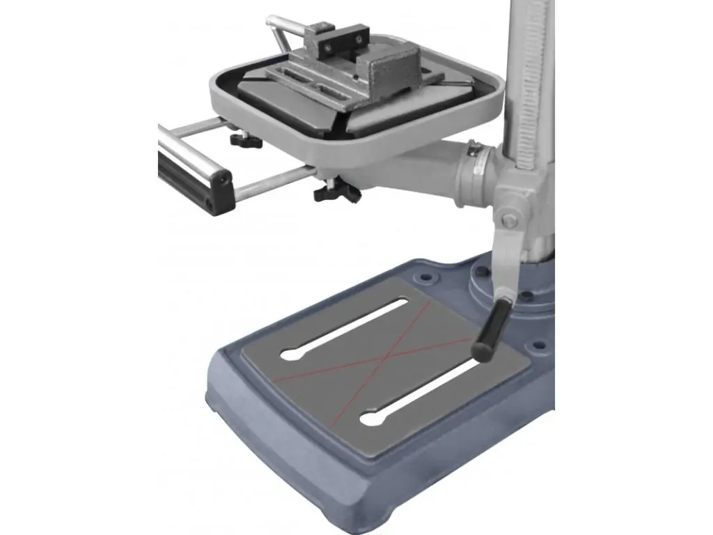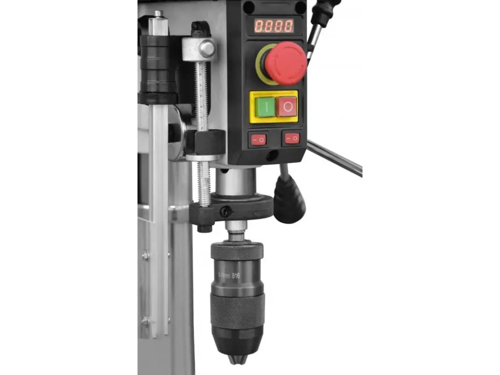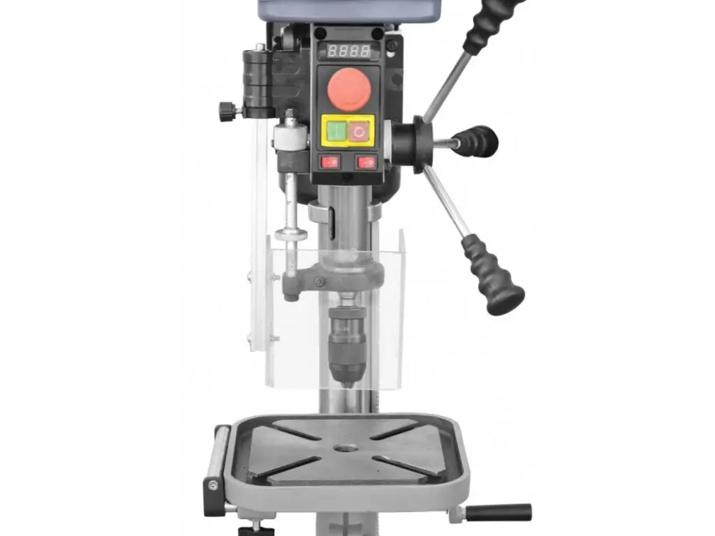 Робочий стіл регулюється по висоті і має нахил під кутом до 45° в обидві сторони, що дозволяє здійснювати широкий діапазон обробки. Швидкозатискний патрон дає змогу замінити робочий інструмент протягом кількох секунд. Для зручності роботи верстат оснащений підсвічуванням робочої зони, яке вмикається натиском кнопки. Цей верстат для свердління металу відмінно підійде для профільних майстерень і навчальних закладів, а також невеликих виробництв.
