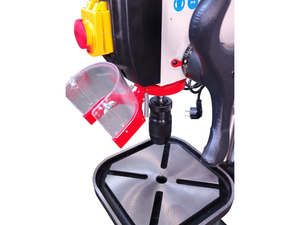 Свердлильний верстат по металу MAST Metalltechnik M-SV1520S-1 - це настільне обладнання для свердління, розсвердлювання, зенкування і цекування металевих заготовок. Оснащений індукційним двигуном потужністю 600 Вт, який має 12 швидкостей обертання шпинделя з діапазоном регулювання від 180 до 2740 об/хв. Хід шпинделя становить 80 мм, максимальний діаметр отвору - 20 мм. Працює від напруги 230 В.