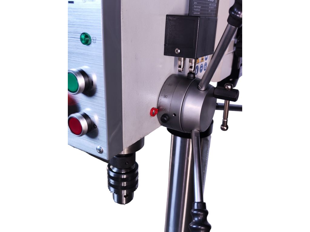 5-ступеневе регулювання швидкості обертання шпинделя у діапазоні 200-2400 об/хв дозволяє підібрати оптимальні параметри роботи. Підйом і опускання шпинделя здійснюються за допомогою ергономічної ручки на бічній панелі. Для роботи з великими деталями стіл знімається. Такий професійний свердлильний верстат можна замовити на нашому сайті з гарантією 12 місяців і доставкою по Україні.