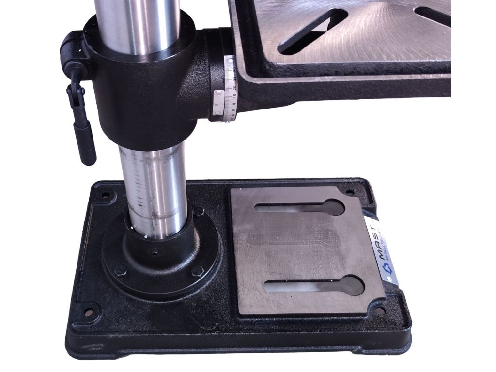 Двигун потужністю 600 Вт забезпечує 12 швидкостей обертання шпинделя у діапазоні 180-2740 об/хв. Підйом і опускання шпинделя здійснюються за допомогою ергономічної ручки на бічній панелі. Стіл верстата регулюється по висоті і куту нахилу відносно шпинделя, що дозволяє якісно виконувати різні завдання. Для роботи з габаритними заготовками стіл можна зняти і у якості опори використовувати основу. Міцна конструкція з високоякісних матеріалів гарантує тривалу і надійну службу обладнання. Замовити настільний свердлильний верстат MAST Metalltechnik M-SV1316S-1 ви можете на нашому сайті з доставкою по Україні.