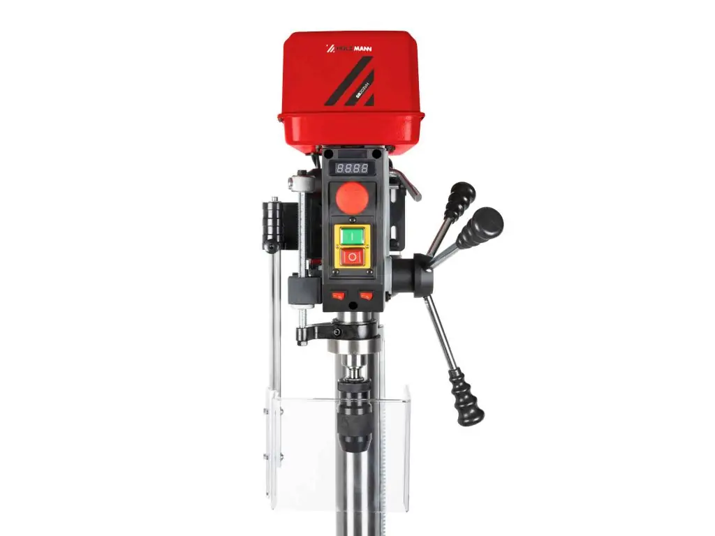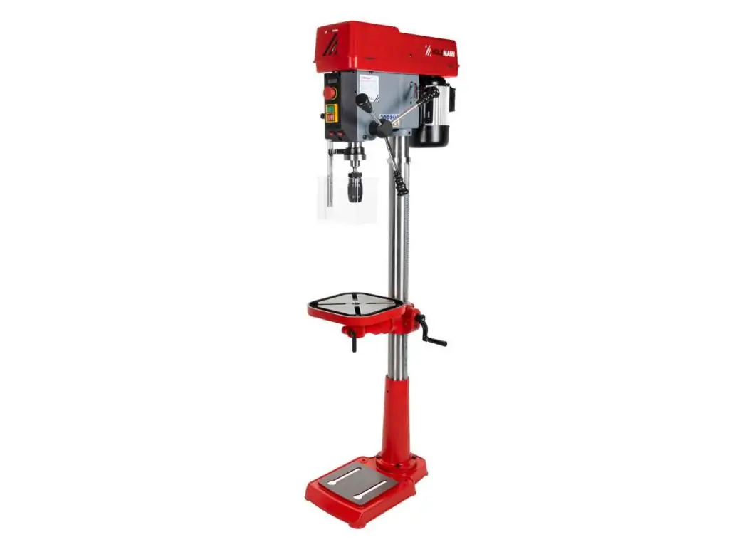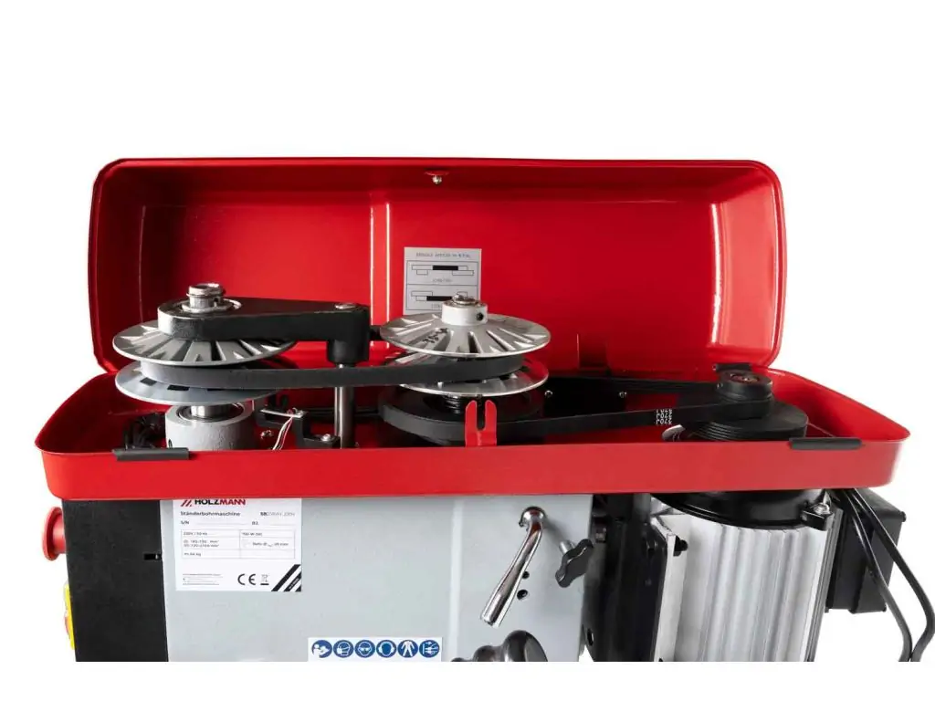 Міцна і жорстка колона та стійка опорна основа забезпечують стабільність робочого процесу. Стіл регулюється за кутом нахилу (+/- 45°) і по висоті. Глибина свердління встановлюється триплечим важелем зі шкалою, є обмежувач глибини свердління. Шпиндель має двоступінчастий діапазон швидкості - 190-730 об/хв і 720-2700 об/хв. Діапазон швидкості встановлюється за допомогою пасової передачі. Додатковими перевагами верстата є центруючий лазер і світлодіодне підсвічування робочої зони. Цей колонний свердлильний верстат має високу точність роботи і тривалий термін служби.