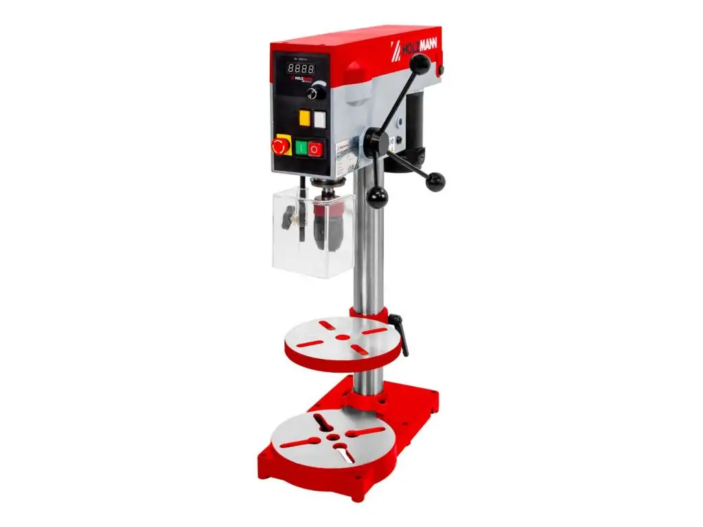 Швидкість обертання плавно регулюється в межах 350-2500 об/хв, що дозволяє адаптувати параметри роботи до особливостей матеріалу і регулювати їх без зупинки верстата. Для максимальної точності свердління пристрій оснащений центруючим лазером. Стіл регулюється по висоті. Для контролю процесу обробки є триплечий важіль зі шкалою глибини свердління і обмежувач глибини свердління. Конструкція верстата стійка і міцна, що забезпечує його надійність і великий робочий ресурс. Такий невеликий свердлильний верстат буде вдалим вибором для майстерень, де необхідна економія робочого простору.