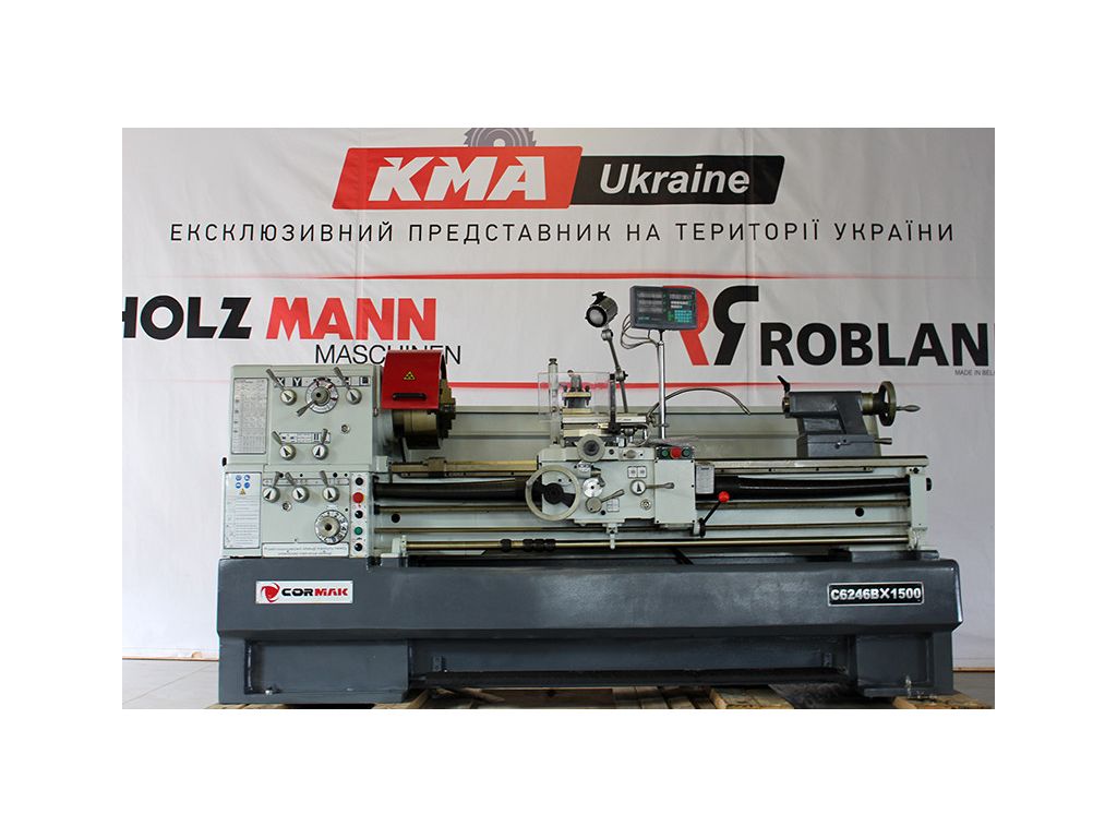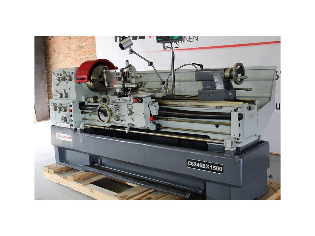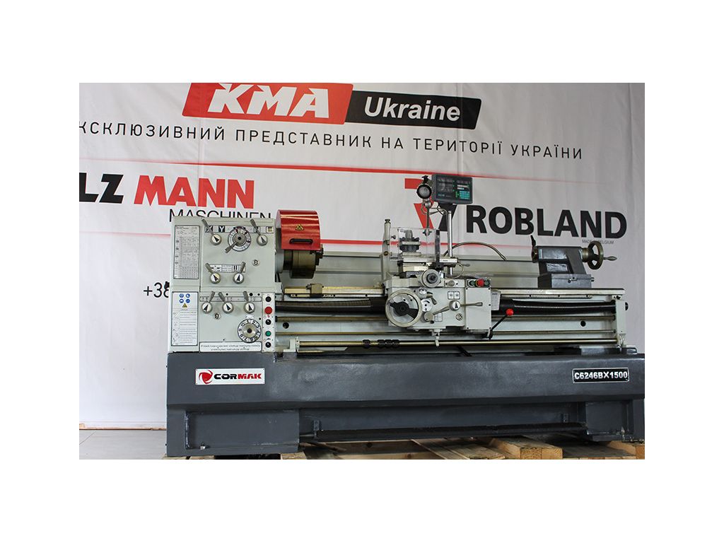 Промисловий універсальний токарний верстат CORMAK C6246Bx1500 (TC) з діаметром обточування - 500 мм, довжиною обточування - 1500 мм, з внутрішнім діаметром шпинделя - 105 мм.