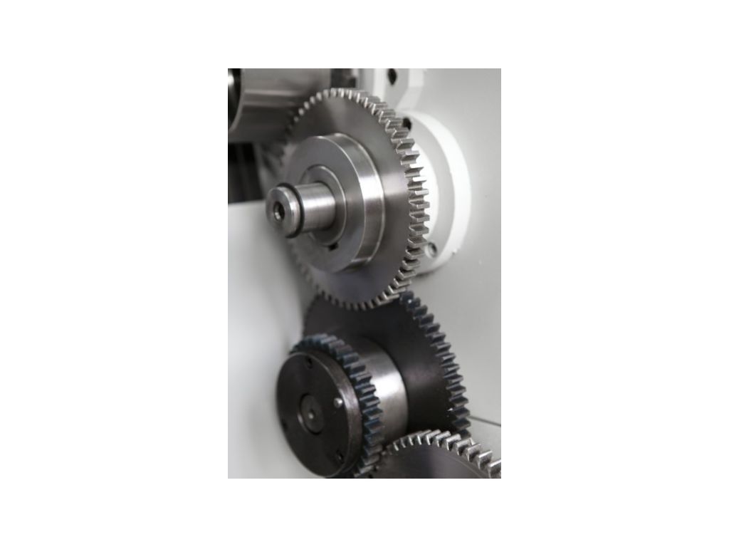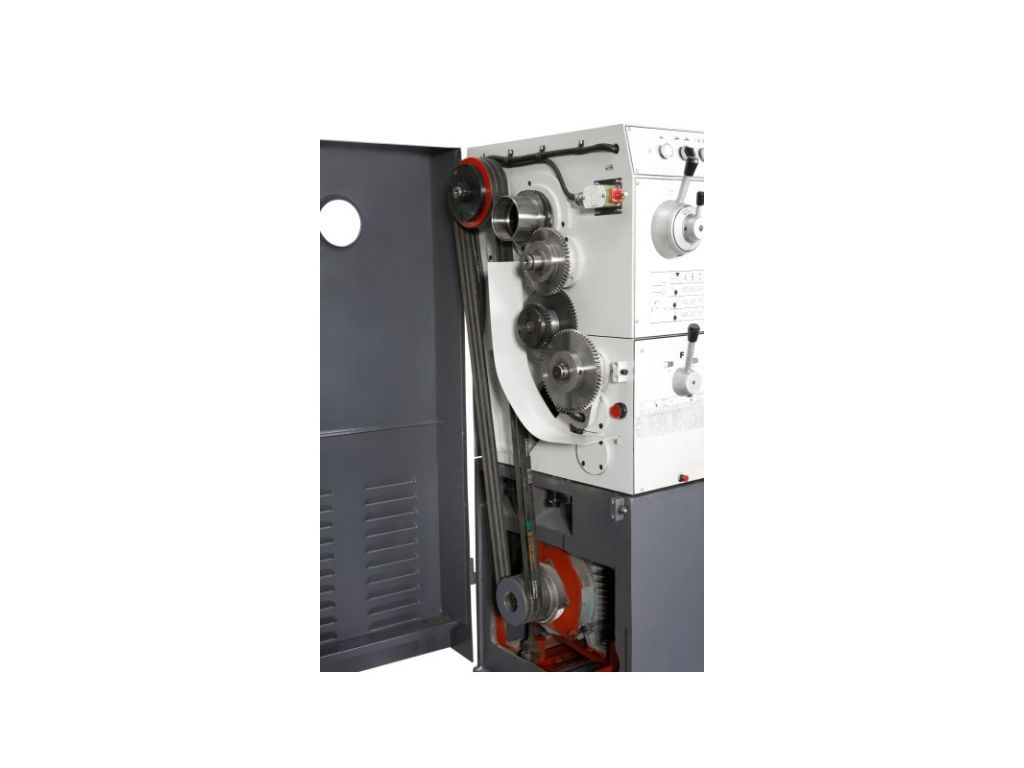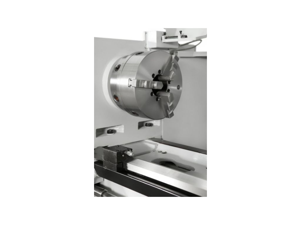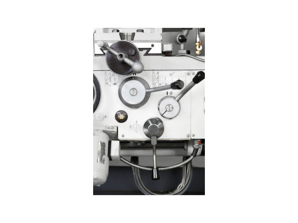 Шпиндель встановлений на прецизійних підшипниках і має затиск Camlock (D1-8). Асинхронний двигун потужністю 5,5 кВт і механічна ступенева коробка передач з важільним перемиканням забезпечують стабільні оберти без просідань і високий крутний момент на низьких швидкостях. Універсальна коробка подач дозволяє нарізати різьбу без зміни шестерень. Масивна конструкція, централізовані точки змащування і вбудована система ЗОР роблять цей універсальний токарний верстат для цеху точним, надійним і безвідмовним.