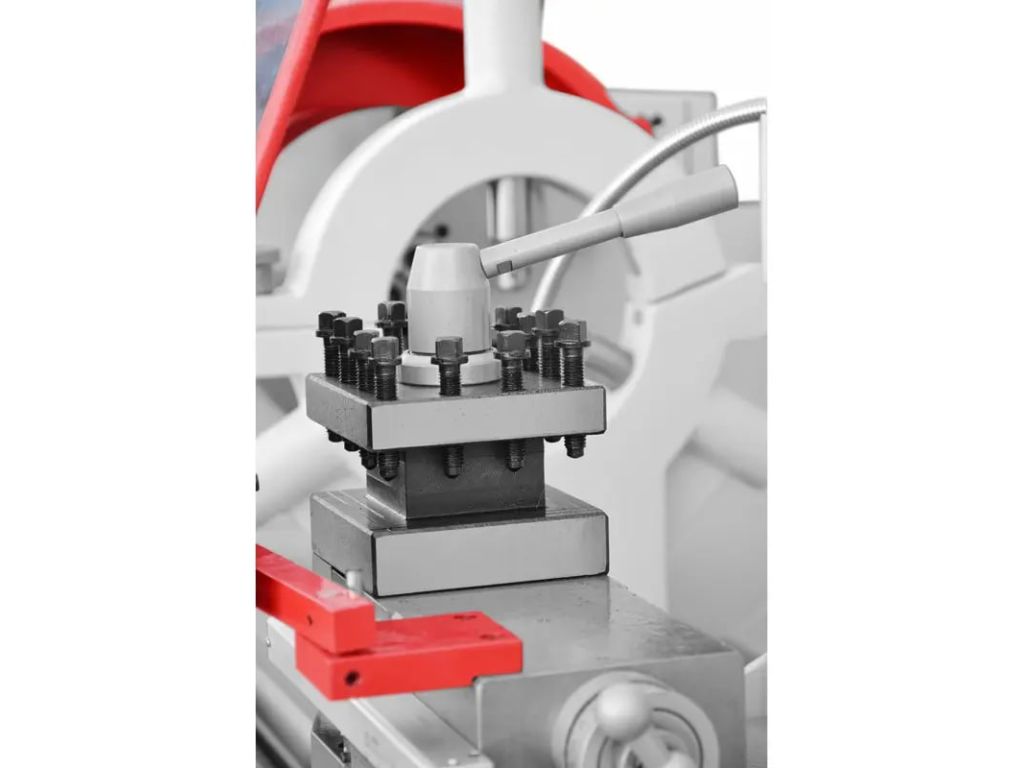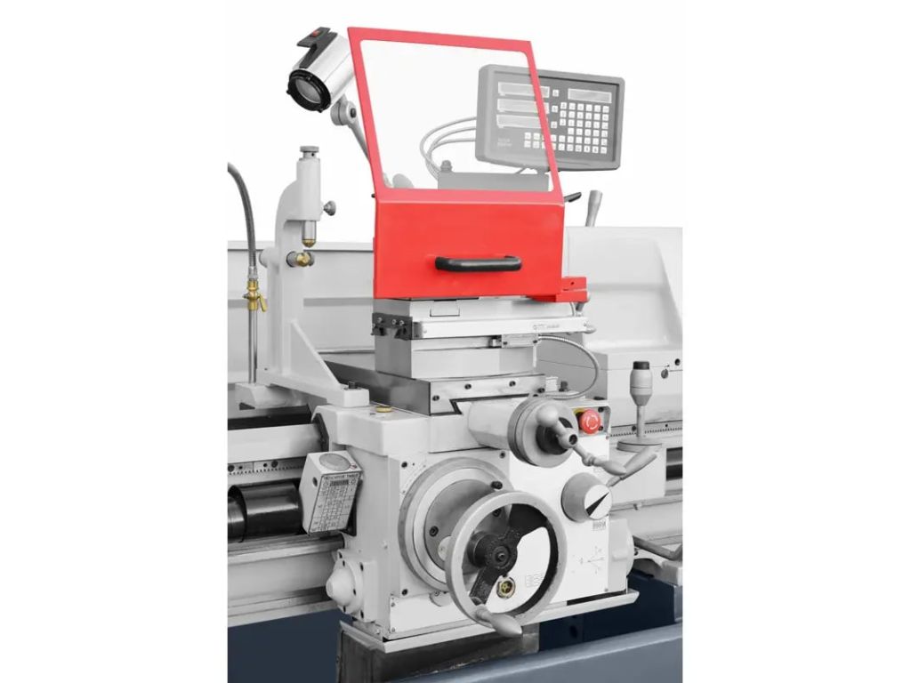 Асинхронний двигун потужністю 7,5 кВт дозволяє знімати великі припуски та ефективно обробляти тверді сплави. Механічна багатоступінчаста коробка з важкими шестернями забезпечує широкий діапазон швидкостей шпинделя в межах 25-1600 об/хв і високий крутний момент на низьких обертах, що важливо при точінні великих діаметрів. Для точності позиціонування та зручності налаштувань цей промисловий токарно-гвинторізний верстат оснащений цифровою індикацією по 3 осях.