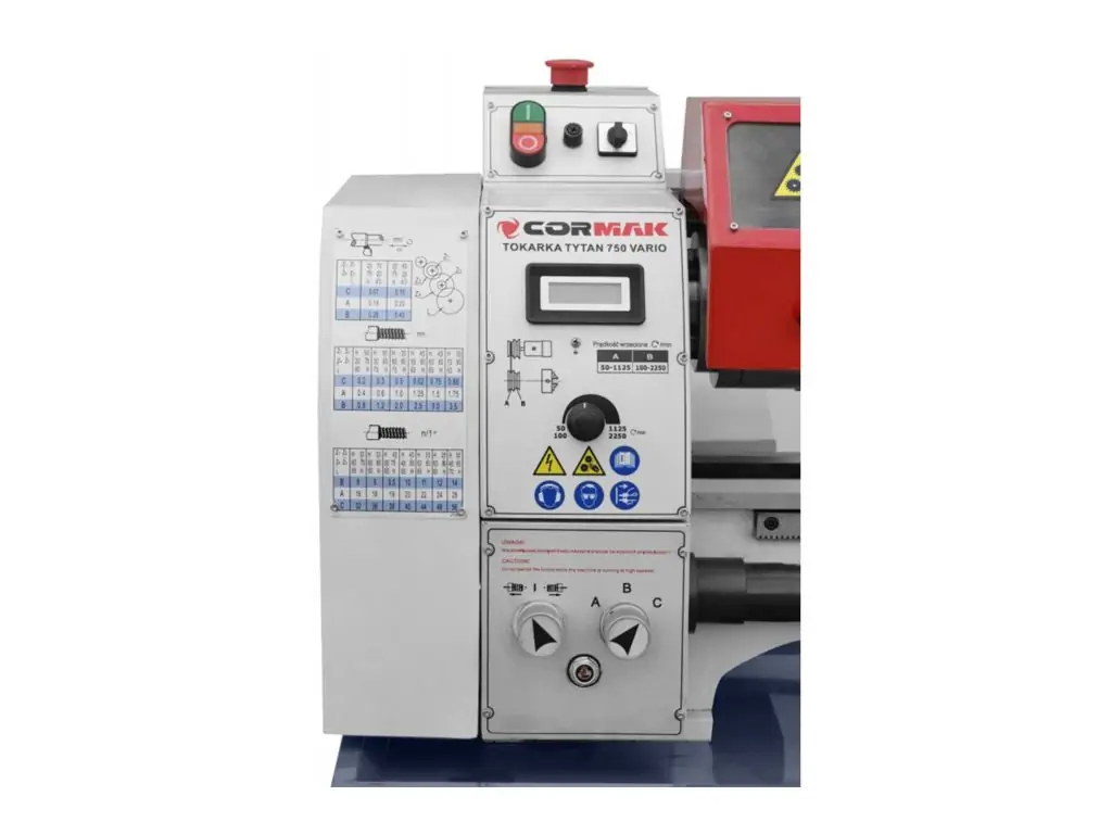 Універсальний токарний верстат CORMAK TYTAN 250x750 Vario призначений для точіння зовнішніх і внутрішніх циліндричних поверхонь, нарізання різьби, свердління, розгортання та зенкування металевих деталей. Сучасний двигун постійного струму потужністю 1,1/1,32 кВт забезпечує стабільність і продуктивність роботи навіть при високих навантаженнях.