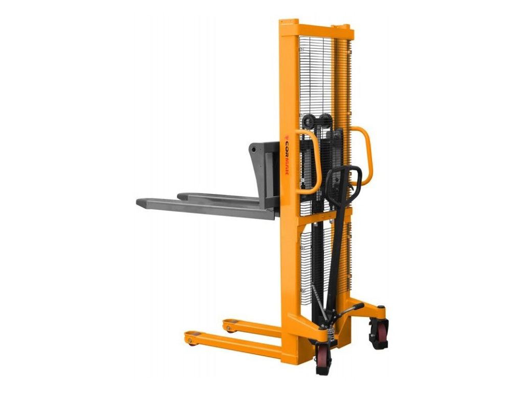 Підйом здійснюється на посилених ланцюгах за допомогою гідравлічного насоса з керуванням важелем і ножною педаллю. Опускання вантажу плавне і контрольоване за рахунок гідравлічного клапана. Щогла зроблена з високоміцної сталі з ребрами жорсткості, що практично виключає деформації під навантаженням. Для підвищення безпеки експлуатації цей штабелер з регульованими вилками оснащений захисною сіткою і запобіжним клапаном.