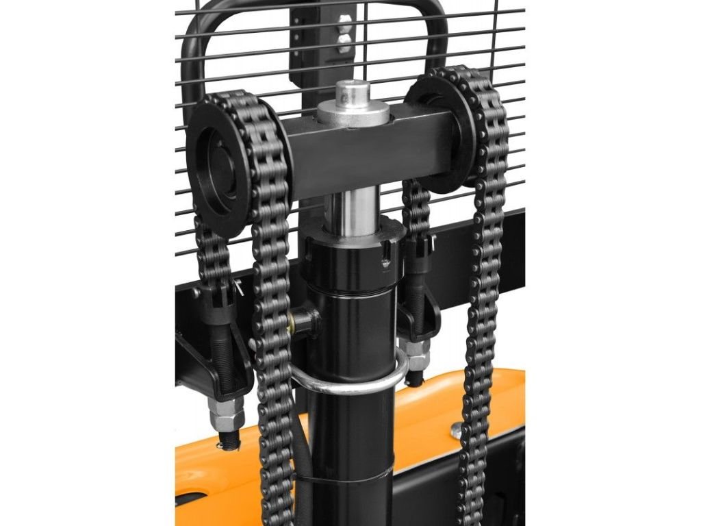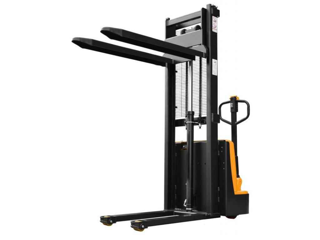 Для руху коліс використовується електродвигун потужністю 2 кВт, для підйому - окремий електропривід потужністю 0,75 кВт. Живлення двигунів здійснюється від двох AGM-акумуляторів 12 Вх65 А·год з можливістю заряджання прямо в пристрої. Швидкість руху до 4,0 км/год та швидкість підйому 100/ 200 мм/с (з навантаженням /без навантаження) значно скорочують робочі цикли. Для безпечного маневрування цей електричний візок-штабелер має режим сповільненого ходу, а його компактні розміри і малий радіус повороту забезпечують зручну роботу у вузьких проходах та обмеженому просторі.