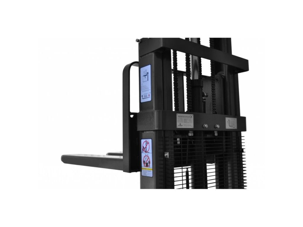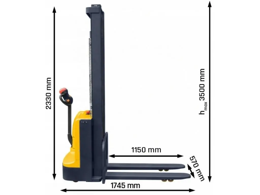 Штабелер Cormak Q15E35 з електричним приводом і підйомом використовується для піднімання вантажів вагою до 1500 кг на висоту до 3500 мм. Потужність електродвигуна підйомного механізму становить 2 кВт, потужність приводу - 750 Вт.