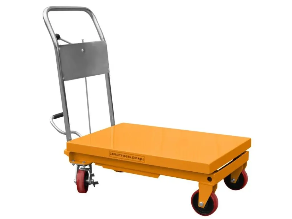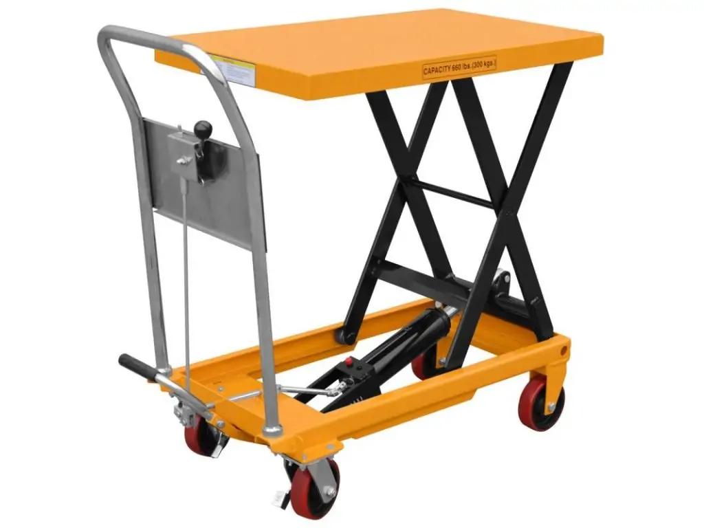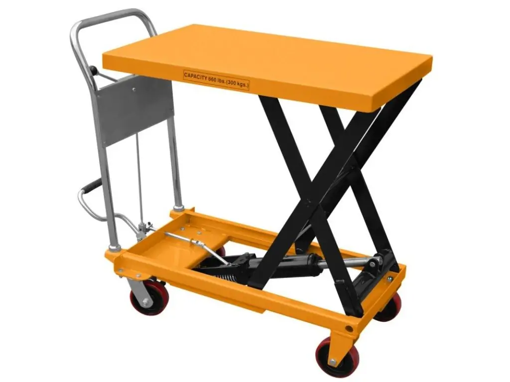 Це складське обладнання, яке використовують для підйому та опускання вантажів на різну висоту. Оснащений міцною платформою, яка піднімається і опускається за допомогою потужних гідроциліндрів, що дозволяє працювати з важкими вантажами.