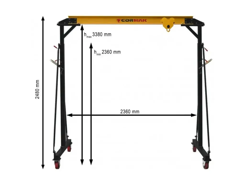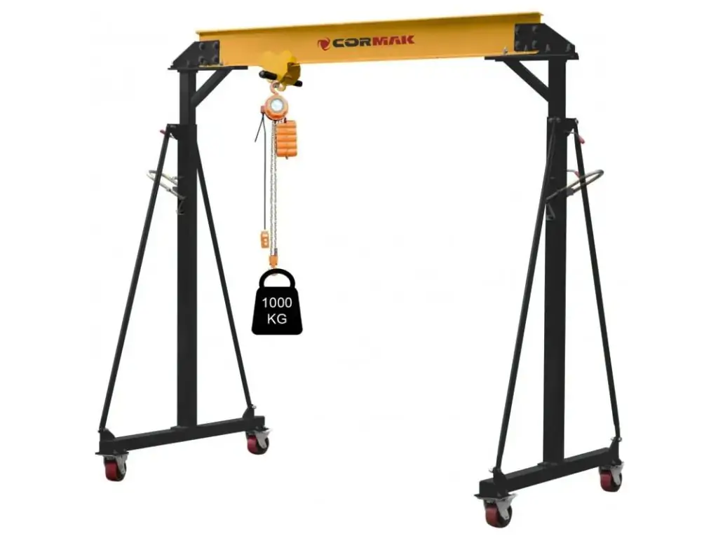 Козловий кран CORMAK PK1 - це універсальний пристрій для піднімання вантажів вагою до 1 тонни. Конструкція виготовлена з якісних матеріалів, надзвичайно міцна, надійна та стійка до скручування. Додаткові поперечні стійки забезпечують високу стійкість і стабільність.