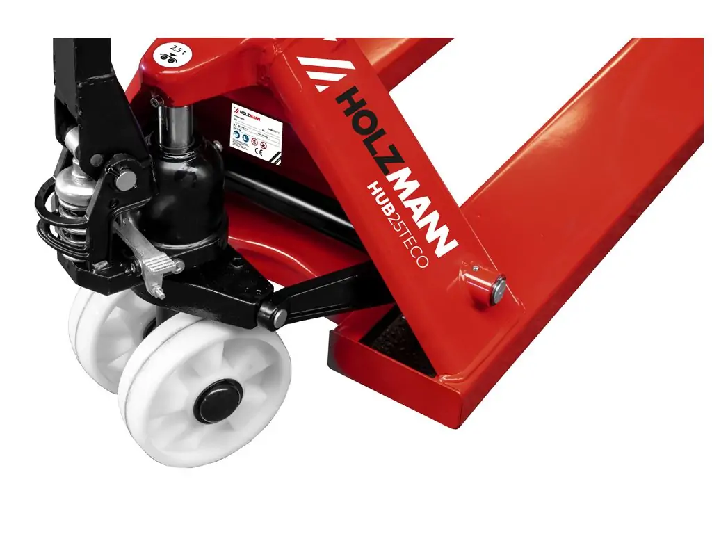 Рокла Holzmann HUB25TECO - це професійне складське обладнання для переміщення піддонів й інших масивних вантажів. Вантажопідйомність становить 2500 кг, розмір вил - 550х1150 мм. Діапазон підйому вил - 85-200 мм. Підйом здійснюється за допомогою надійного гідравлічного механізму і плавного гідравлічного насоса. Виконана з високоякісної сталі з антикорозійним покриттям.