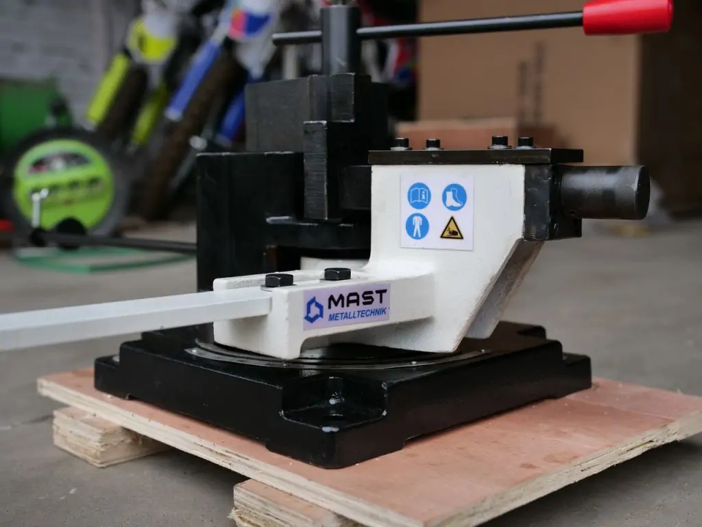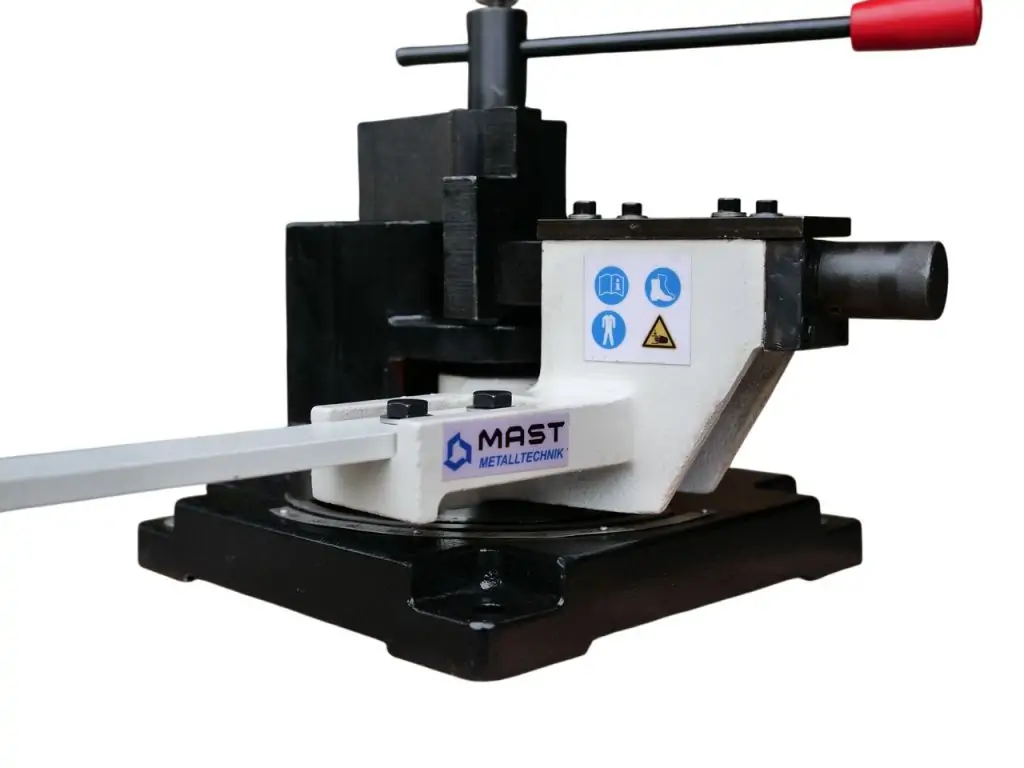 Універсальний листозгинальний верстат MAST Metalltechnik M-UB100A — це компактний ручний пристрій для холодного і гарячого згинання листового металу та профілю круглого і квадратного перетину. Монтажні отвори в станині дозволяють надійно закріпити верстат на верстаку чи іншій робочій поверхні, а довгий важіль з прогумованим хватом створює зусилля згинання без великого фізичного навантаження на оператора. Максимальний кут згину становить 120°.
