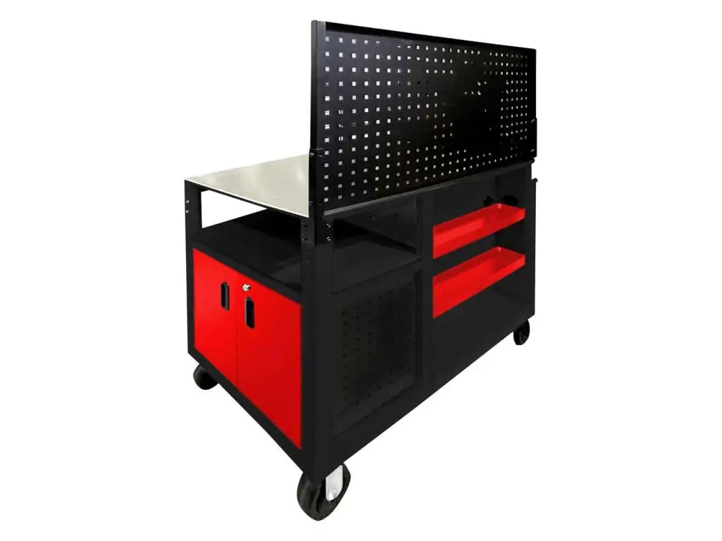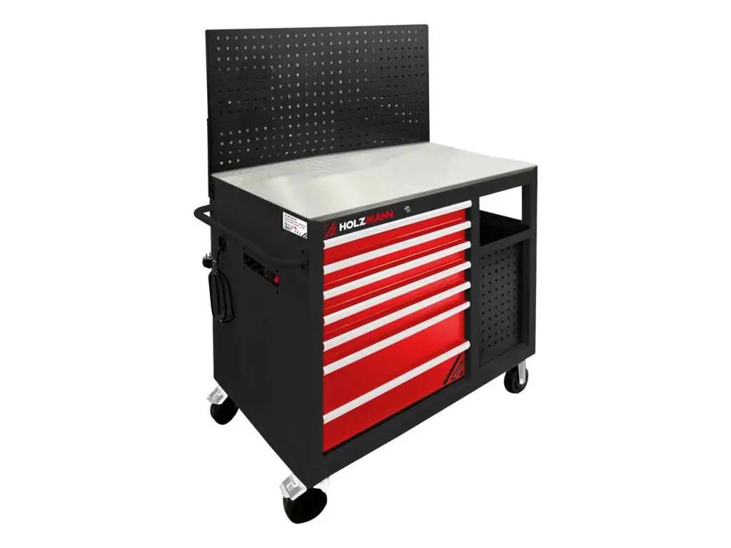 Для зберігання габаритного обладнання є окремий відсік з дверцятами, який закривається на ключ. Перфорована панель дає можливість закріпити часто використовувані інструменти для швидкого доступу до них. Вбудований подовжувач 230 В з 3 розетками, USB-портом та вимикачем дозволяє підключити електроінструмент прямо на верстаку. Поворотні колеса з фіксацією дають змогу легко переміщати верстак по майстерні та надійно зафіксувати його у потрібному місці. Міцна сталева конструкція робить цей мобільний верстак на колесах надійним і довговічним.