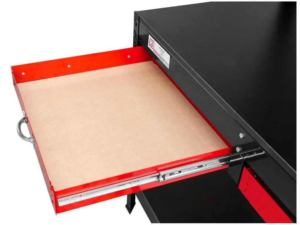 Стільниця має розмір 1200х600 мм і висоту 900 мм, витримує навантаження до 100 кг. Під стільницею розміщені 2 ящики на кулькових опорах розміром 515х450 мм. Нижня сталева полиця розміром 1210x230 мм призначена для розміщення обладнання, коробок і заготовок. На верхню балку можна вмонтувати освітлення, завдяки чому цей універсальний верстак буде ще більш зручним і практичним.