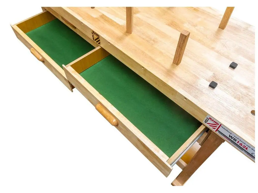 Особливістю верстака є вбудовані лещата, що забезпечує зручність і функціональність робочого місця без втрати простору. Для зберігання інструментів і аксесуарів є 4 місткі шухляди, максимальне навантаження на кожну може бути до 30 кг. Полиця у нижній частині верстака дозволяє зручно зберігати заготовки та великі інструменти. Для встановлення струбцин і клинів є спеціальні отвори. Купити столярний верстак Holzmann WB 162L за вигідною ціною ви можете на сайті офіційного постачальника виробника KMA.UA.