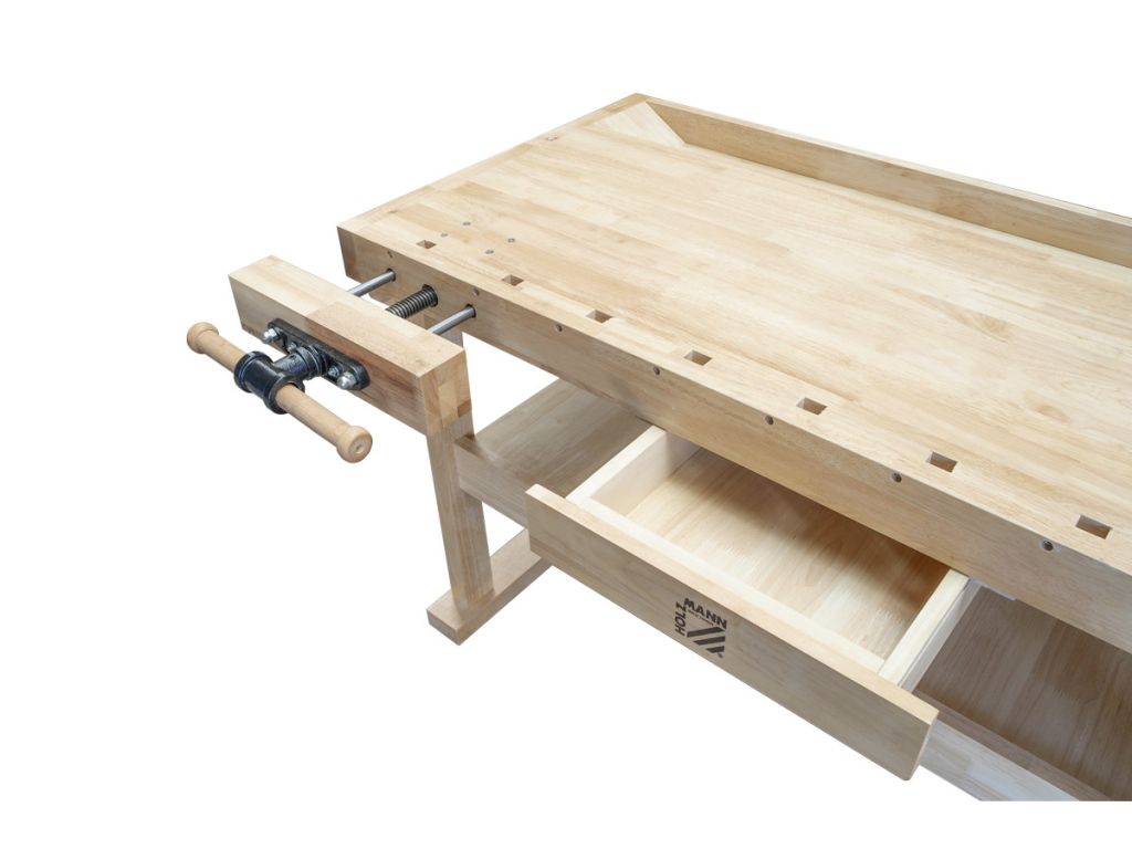 Простора стільниця з каучукового дерева має товщину 20 мм і витримує навантаження до 150 кг. Висота столу 820 мм оптимальна для роботи з деревиною. Для фіксації заготовок на робочій поверхні є двоє вбудованих лещат. Для зберігання дрібного інструменту під стільницею є ящик розміром 320х315х70 мм, а для зручного розміщення обладнання і деталей - велика, міцна нижня полиця. Ніжки з нижніми поперечинами забезпечують високу стійкість, що робить цей верстак столярний безпечним і зручним.