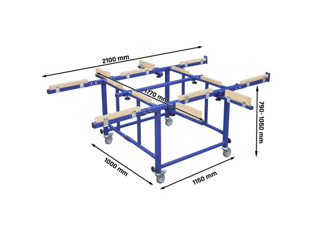 Регульована висота підйому до 1000 мм. На поверхні столу є дерев'яні накладки, які не пошкоджують поверхню обробленого матеріалу.