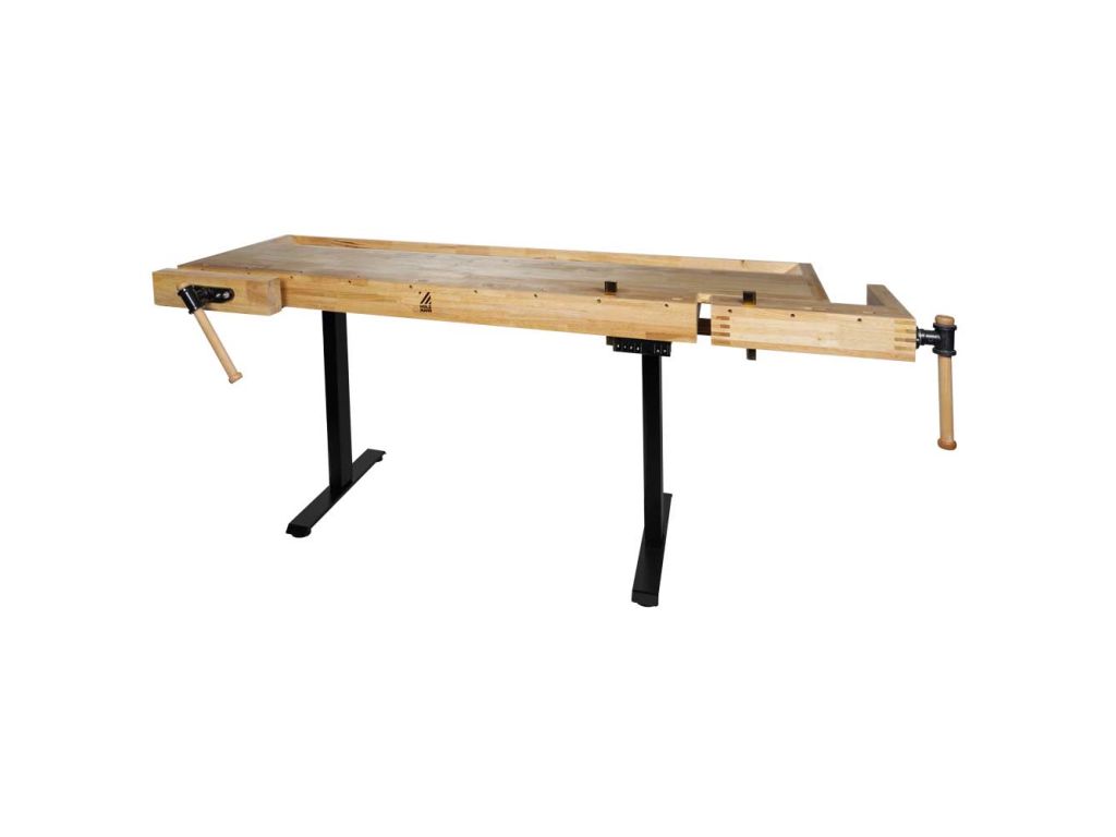 Стільниця виготовлена з каучукового дерева, має розмір 1885х615 мм і товщину 23 мм, що дозволяє зручно розмістити на робочій поверхні потрібний інструмент. Двоє лещат шириною 400 мм з максимальним ходом 125 мм роблять верстак ще більш функціональним. Є великий відсік для зберігання аксесуарів. Цей верстак з електричним регулюванням відповідає європейським стандартам якості та безпеки, що підтверджує сертифікат СЄ.