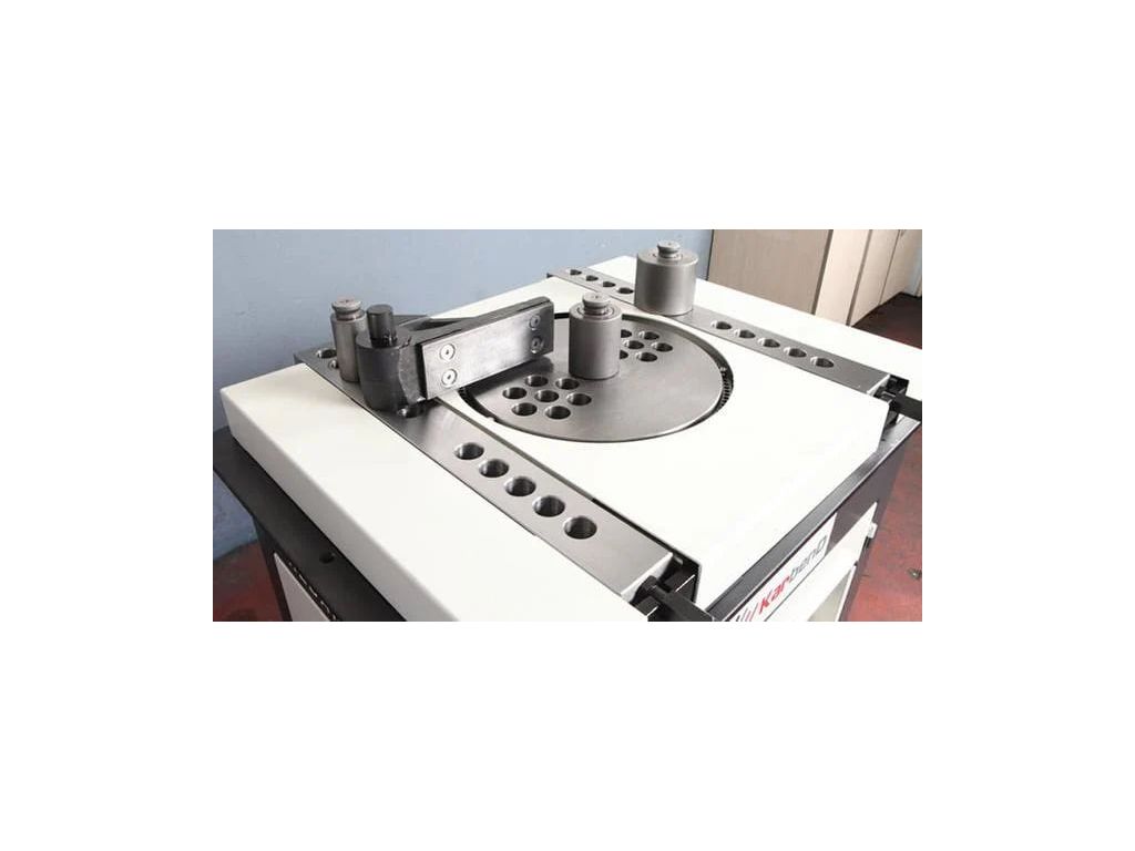 Згинач арматури, прутків, дроту та плоских прутків. Ідеально підходить для згинання як арматурних стремен, так і різних арматурних ферм з гладкого та ребристого дроту. Завдяки використанню відповідних інструментів можна гнути елементи для художньої ковальства, які використовуються, наприклад, у виробництві воріт, огорож, балюстрад і т.д. Зварна сталева рама та робочий стіл забезпечують стабільну роботу навіть у складних умовах. Машина має два режими роботи: автоматичний та ручний.