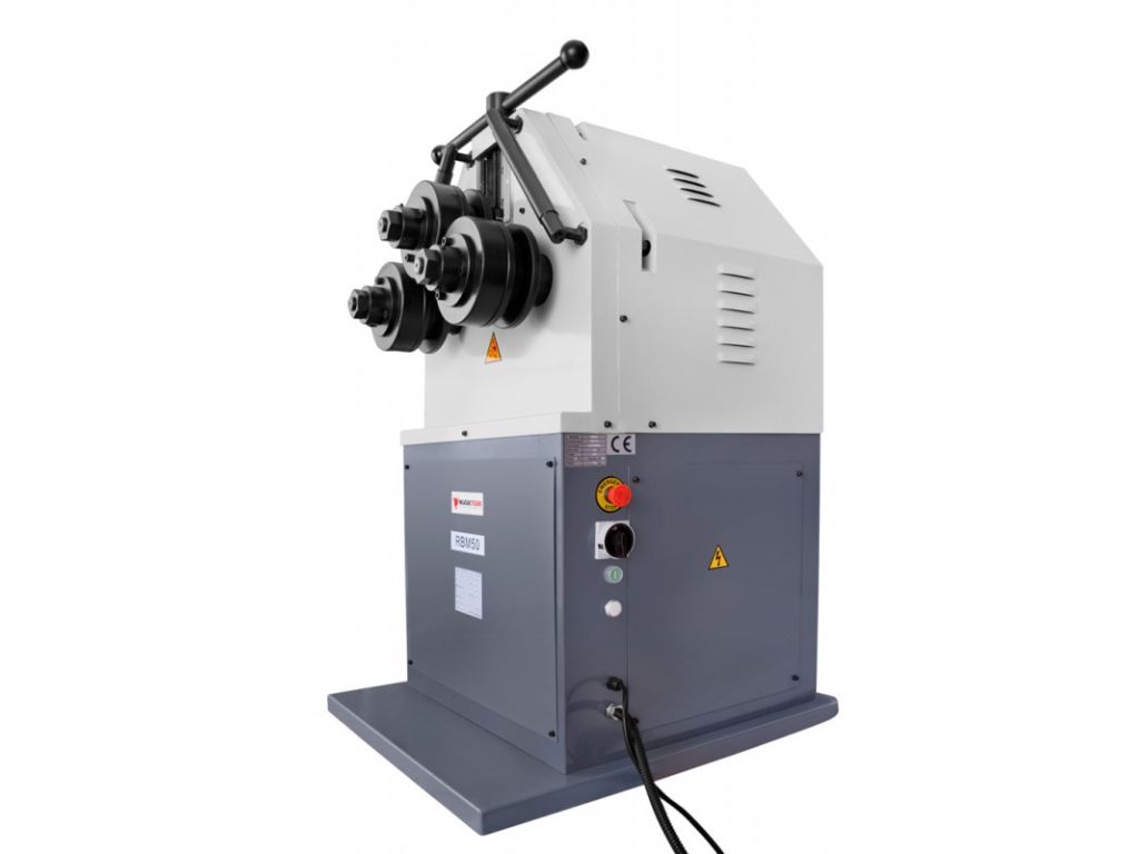 Електромеханічний згинальний верстат CORMAK RBM 50 призначений для якісного згинання профільних труб, смуги та прутка з метою отримання дугоподібної форми деталей у формі арок, кола, спіралей й інших форм. Верстат укомплектований трьома роликами, два з них є привідними та запускаються через редуктор. Радіус вигину можна регулювати верхнім роликом за допомогою важеля та ноніунсної шкали у верхній частині верстата. Ролики регулюються по ширині. Обертання вліво-вправо зі швидкістю 9,3 об/хв. Діаметр валу - 50 мм, діаметр роликів - 160 мм.