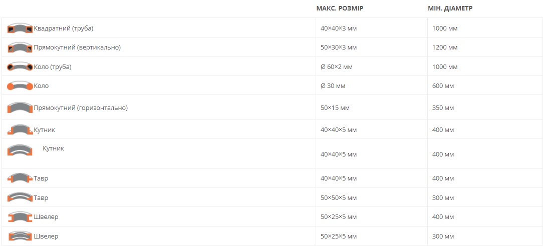 Максимальний розмір труб – 50×2 мм/40×40×3 мм.