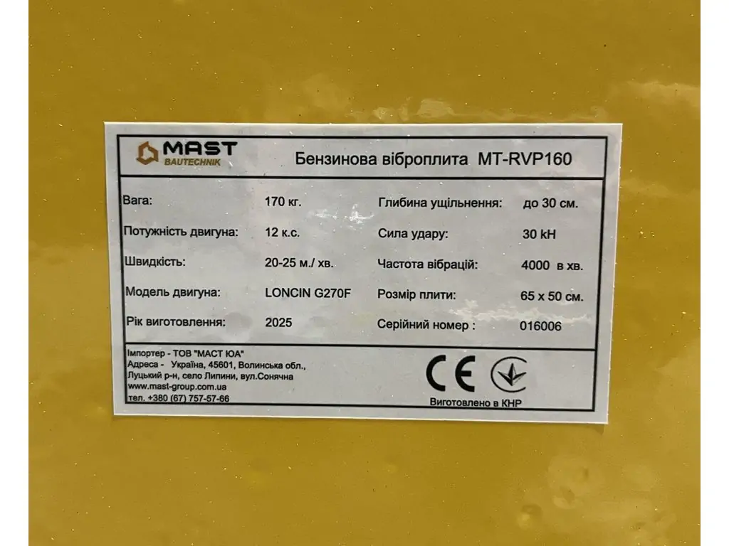 Бензинова віброплита MAST Bautechnik MT-RVP160 - це професійне обладнання для ущільнення грунту, піску, щебеню, гравію та інших сипучих матеріалів при підготовці основи під фундамент, вкладання бруківки та плитки і подібних робіт. 4-тактний бензиновий двигун Loncin G270F потужністю 9 к.с./6,3 кВт допомагає забезпечити стабільну частоту вібрацій для вібраційного вузла із відцентровою силою 30 кН, що дозволяє виконувати ущільнення на глибину до 50 см (залежно від типу і вологості поверхні). Вага 170 кг забезпечує високу статичну притискну силу.