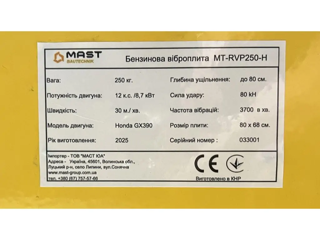 Бензинова віброплита MAST Bautechnik MT-RVP250-H - це важке обладнання для ущільнення грунту, піску, гравію, щебеню та інших сипучих матеріалів при професійних будівельних і дорожніх роботах. Адаптований до тривалого навантаження і великих об’ємів робіт 4-тактний бензиновий двигун Honda GX390 потужністю 12 к.с./8,7 кВт забезпечує стабільну роботу вібраційного механізму з частотою 3700 VPM та відцентровою силою 80 кН. Глибина ущільнення сягає 80 см (залежно від типу і вологості матеріалу).