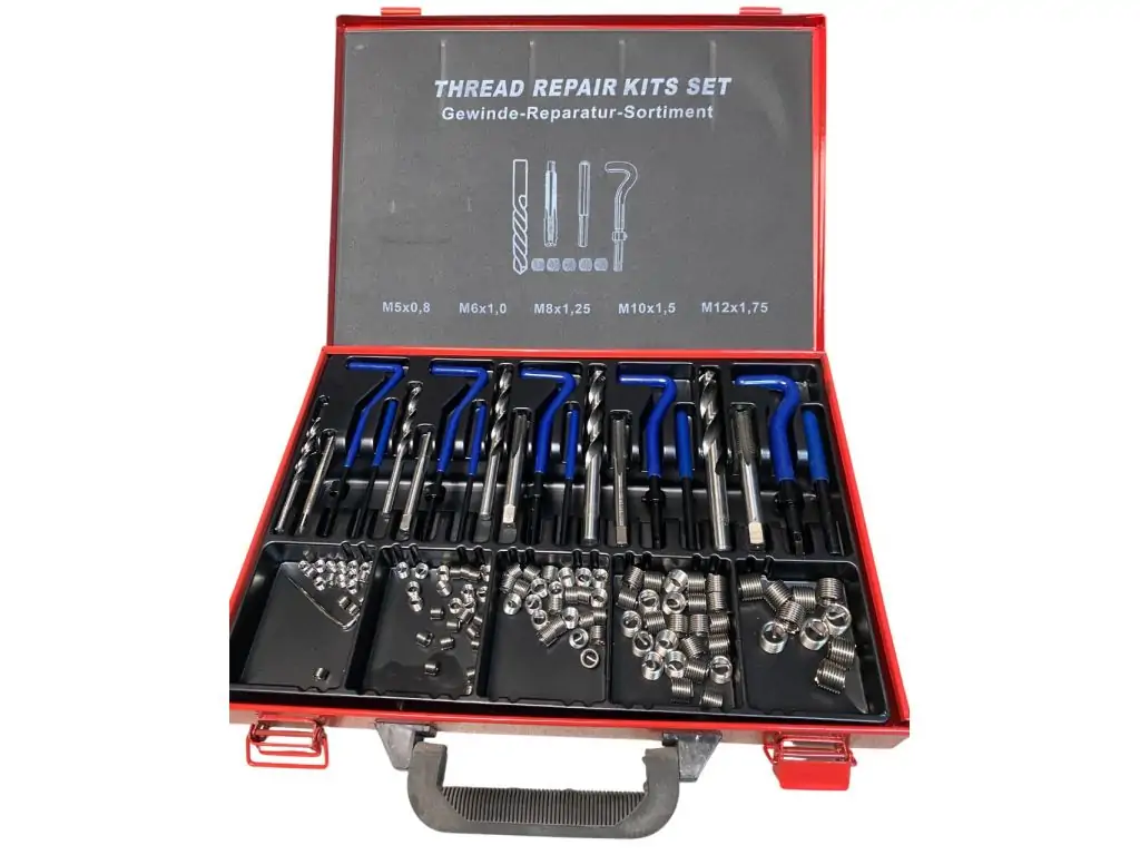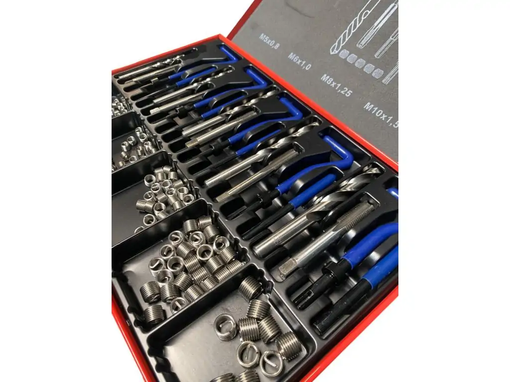 Гнучкі спіральні вставки типу Helicoil створюють надзвичайно міцне з’єднання. Комплект охоплює найбільш поширені типорозміри метричної різьби і підходить для більшості стандартних кріплень, що робить його універсальним для широкого спектра застосувань. Цей набір для ремонту різьби містить все необхідне для роботи, тому докуповувати додатковий інструмент не потрібно.
