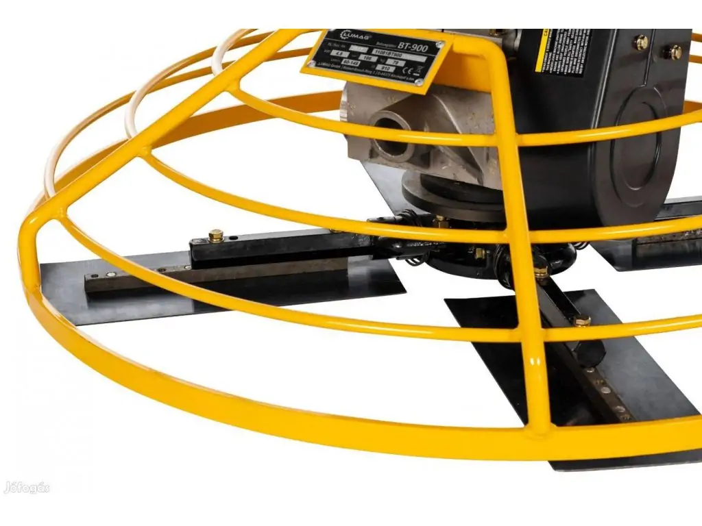 Затиральна машина по бетону Lumag BT900 з діаметром ротора 910 мм і витривалим 4-тактним бензиновим двигуном LONCIN G200F потужністю 4,8 кВт забезпечує швидке та ефективне згладжування і вирівнювання бетонних поверхонь, промислових підлог, композитних стяжок та асфальту. Оснащена 4 лопатями розміром 350х150 мм, які мають регульовану швидкість обертання у діапазоні 60-140 об/хв та кут нахилу 0-15°. Це дозволяє якісно опрацьовувати різні типи поверхонь, кути та ділянки вздовж стін. Для захисту лопатей від ударів об перешкоди є запобіжне кільце. Запуск за допомогою ручного стартера.
