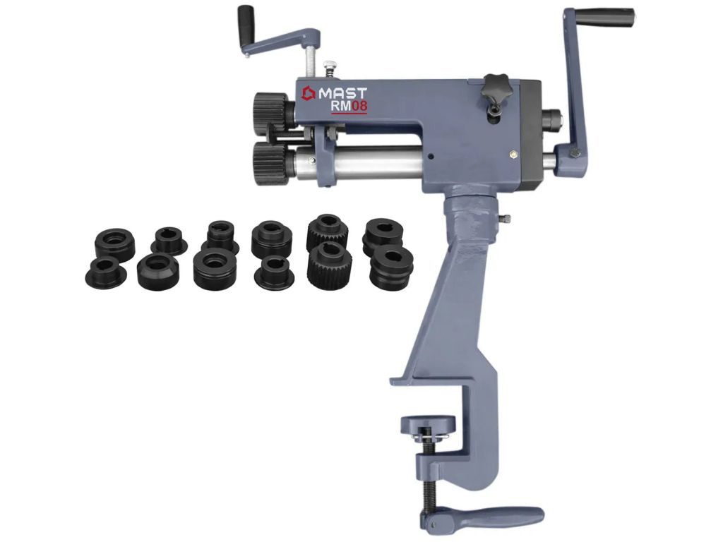 Зигувальний верстат MAST Metalltechnik RM 08 - це компактне, портативне обладнання для створення ребер жорсткості, формування бортів і фальцевих з'єднань на листовому металі товщиною до 0,8 мм. Комплектується шістьма наборами змінних роликів різного профілю, що дає змогу виконувати різнотипні операції.