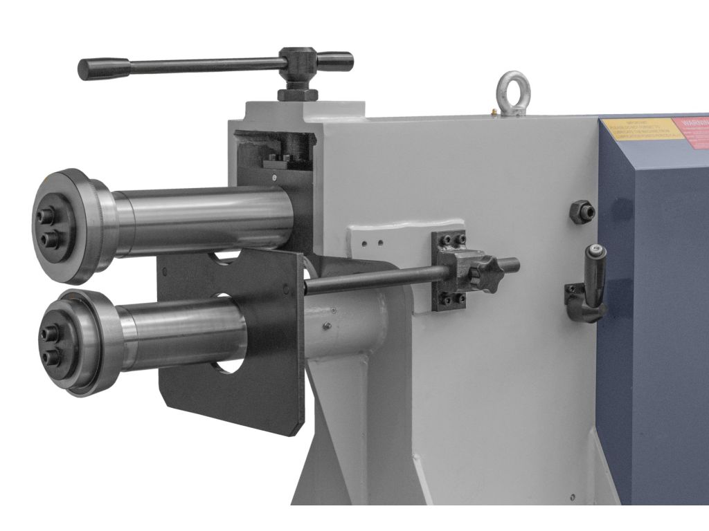 Вали виготовлені із загартованої сталі і встановлені на бронзових втулках для зменшення тертя і збільшення терміну служби. Регульований верхній вал дозволяє точно налаштовувати відстань між роликами під товщину металу. Чотири набори змінних роликів розширюють спектр можливостей обладнання. Завдяки жорсткій, масивній станині, цей зигувальний верстат для листа 4 мм залишається точним і стабільним навіть при найвищих навантаженнях. Ножна педаль звільняє руки для подавання та утримання листа.