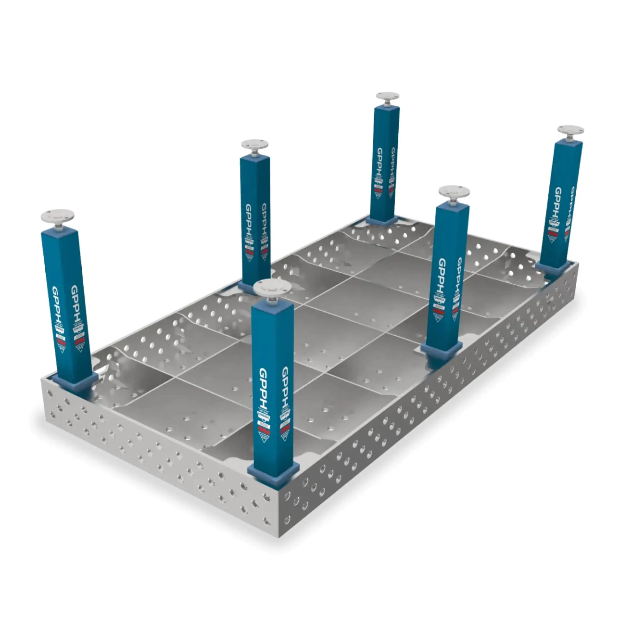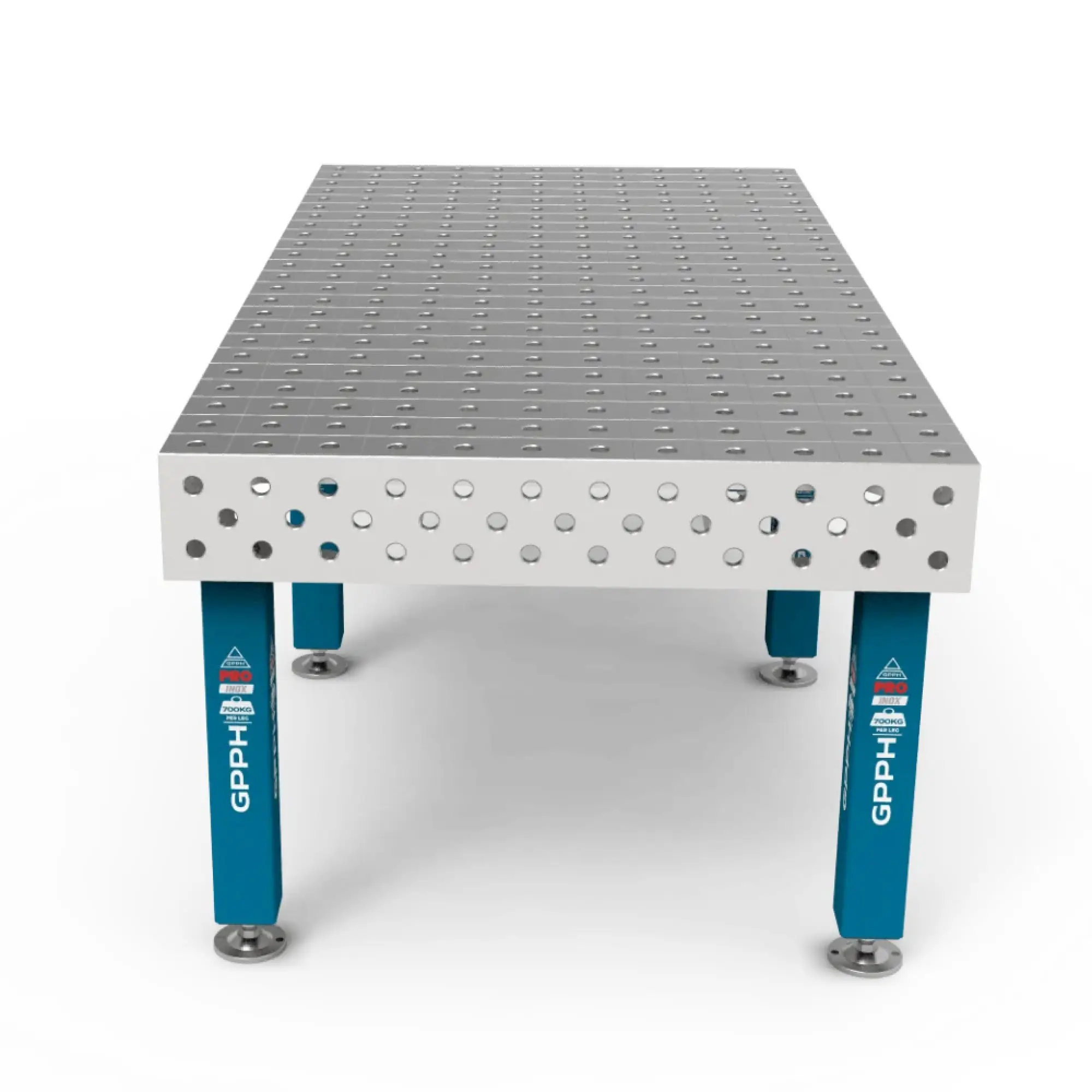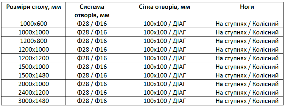 Поверхня стільниці має фрезеровані та фасковані отвори з допуском ±0,05 мм, що полегшує встановлення інструментів. Для точного позиціонування конструкції є гравірована або діагональна шкала 100х100 мм. Цей професійний зварювальний стіл може поставлятися з ніжками на ступнях або на колесах (на вибір). Вантажопідйомність - 700 кг на ніжку. Є 10 варіантів розмірів столу.