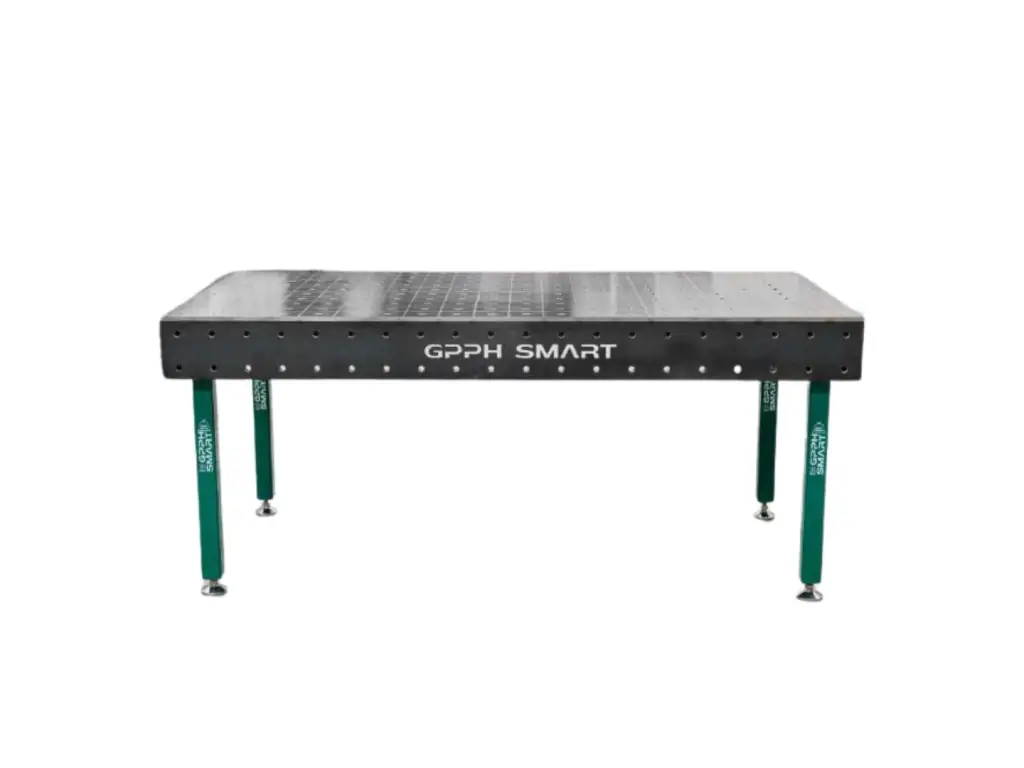 Зварювальний стіл GPPH SMART 12 мм – 2400х1200 мм - це професійне рішення для зварювальних і складальних робіт, яке забезпечує точне позиціонування і надійну фіксацію металоконструкцій при обробці. Стільниця товщиною 12 мм виготовлена з вуглецевої сталі S355J2+N і має густу сітку ребер жорсткості на внутрішній поверхні, що забезпечує ідеальну площинність (допуск ±0,5 мм), стійкість до термічних поводжень і відсутність прогину під навантаженням. Розмір стільниці 2400х1200 мм і вантажопідйомність 1200 кг дозволяють працювати з великими і важкими деталями та фіксувати кілька елементів одночасно.