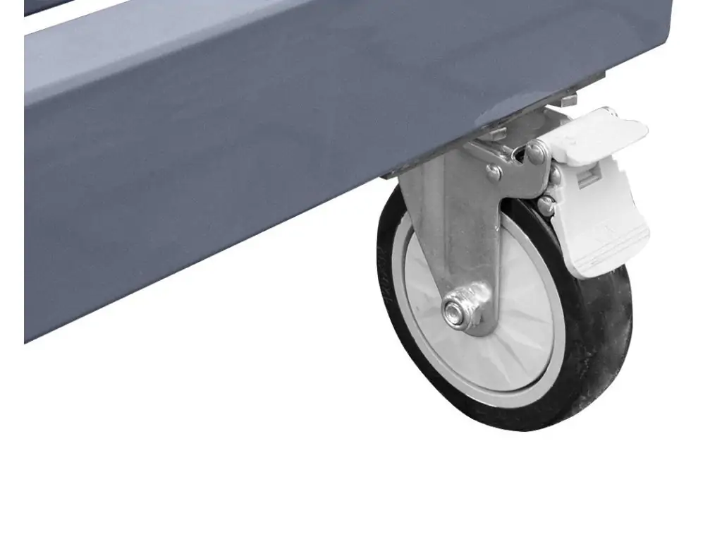 Стільниця виготовлена з низьколегованої конструкційної сталі S355, що забезпечує стійкість до навантажень без деформацій і високу опірність до термічних поводжень. Ребра жорсткості на внутрішній поверхні гарантують збереження ідеальної площинності протягом всього терміну служби. Система перфорації D16 на стільниці і бокових поверхнях дозволяє швидке встановлення оснастки, точне позиціювання деталей і можливість створення складних збірних конфігурацій. Для захисту від задирок і деформацій кожен отвір має фаску. Цей зварювальний стіл для виробництва оснащений посиленими поворотними колесами з фіксацією, що дозволяє легко його переміщати навіть із закріпленою конструкцією.