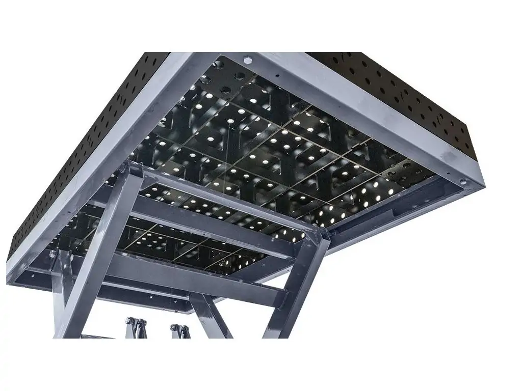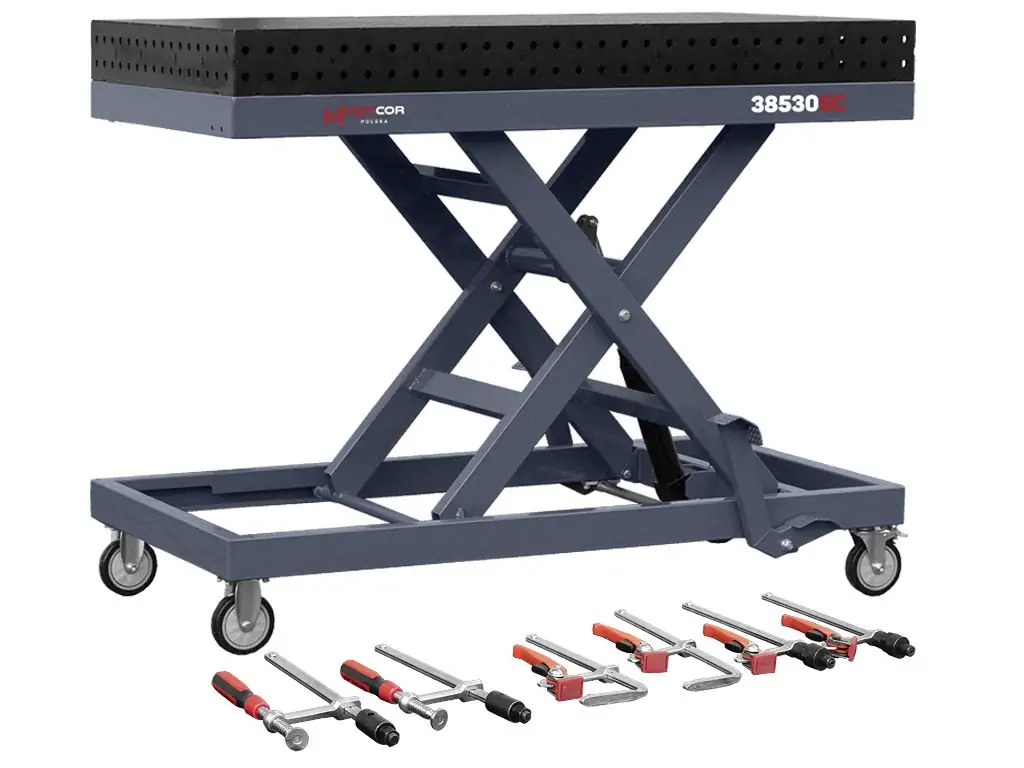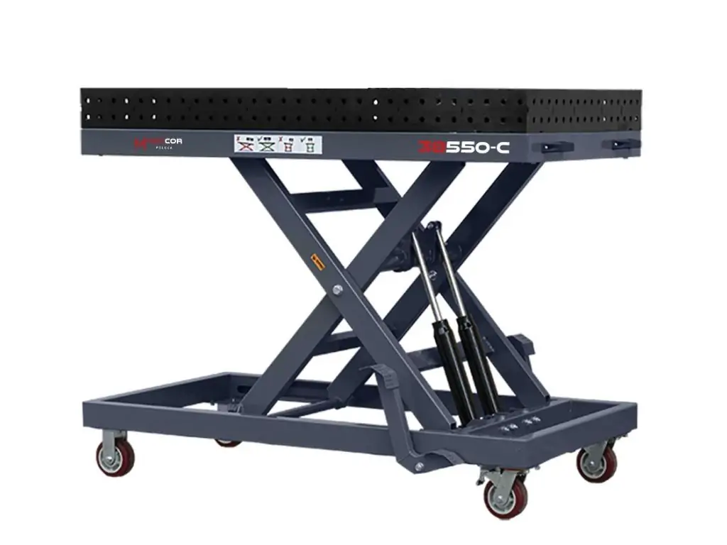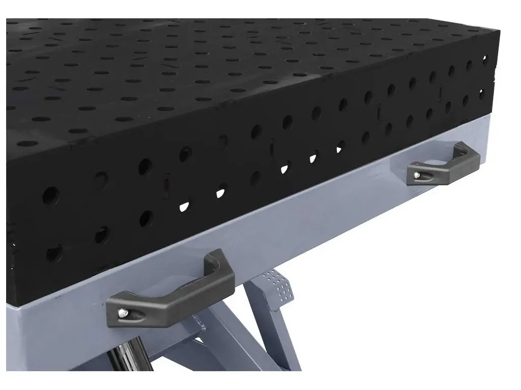 Гідравлічна система підйому ножичного типу дає змогу плавно регулювати висоту в діапазоні 470-1075 мм. По всій поверхні столу розташовані отвори діаметром 16 мм (стандарт D16), кожен з яких має фаску для легкого встановлення оснастки. Отвори на бічних стінках дозволяють закріпити деталь перпендикулярно до основної робочої поверхні, що перетворює цей регульований зварювальний стіл на повноцінну 3D-систему позиціювання. Посилені, поворотні на 360° колеса дозволяють легко переміщати стіл по робочій зоні або повертати його навколо своєї осі для зручного доступу до заготовки.